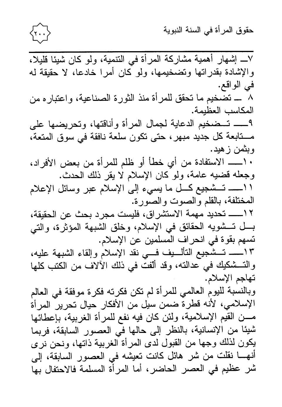 7 - إشهار أهمية مشاركة المرأة في التنمية، ولو كان شيئا قليلا، والإشادة بقدراتها وتضخيمها، ولو كان أمرا خادعا، لا حقيقة له في الواقع.