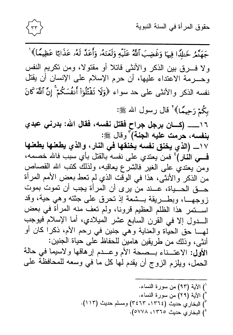17 - (الذي يخنق نفسه يخنقها في النار، والذي يطعنها يطعنها في النار) (¬4) فمن يعتدي على نفسه بالقتل بأي سبب فالله خصمه، ومن يعتدي على الغير فالشرع يعاقبه، ولذلك كتب الله القصاص من الذكر والأنثى، هذا في الوقت الذي لم تعط بعض الأمم المرأة حق الحياة، عند من يرى أن المرأة يجب أن تموت بموت زوجها، وبطريقة بشعة إذ تحرق على جثته وهي حية، وقد استمر هذا الظلم العظيم قرونا، ولم تعف منه المرأة في بعض الدول إلا في القرن السابع عشر الميلادي، أما الإسلام فيوجب لها حق الحياة والعناية وهي جنين في رحم الأم، ذكرا كان أو أنثى، وذلك من طريقين هامين للحفاظ على حياة الجنين: