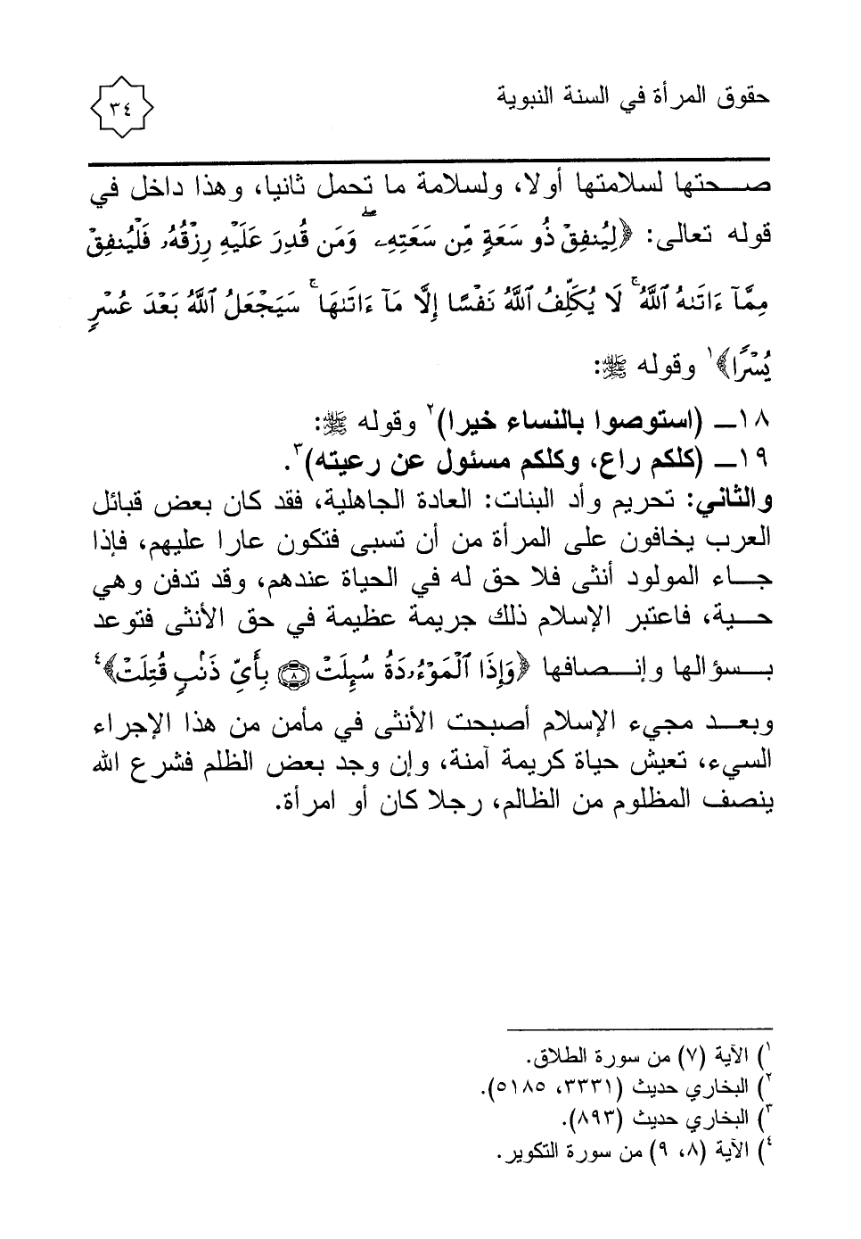 والثاني: تحريم وأد البنات: العادة الجاهلية، فقد كان بعض قبائل العرب يخافون على المرأة من أن تسبى فتكون عارا عليهم، فإذا جاء المولود أنثى فلا حق له في الحياة عندهم، وقد تدفن وهي حية، فاعتبر الإسلام ذلك جريمة عظيمة في حق الأنثى فتوعد بسؤالها وإنصافها {وَإِذَا الْمَوْءُودَةُ سُئِلَتْ (8) وَإِذَا الْمَوْءُودَةُ سُئِلَتْ (8)} (¬4) وبعد مجيء الإسلام أصبحت الأنثى في مأمن من هذا الإجراء السيء، تعيش حياة كريمة آمنة، وإن وجد بعض الظلم فشرع الله ينصف المظلوم من الظالم، رجلا كان أو امرأة.
