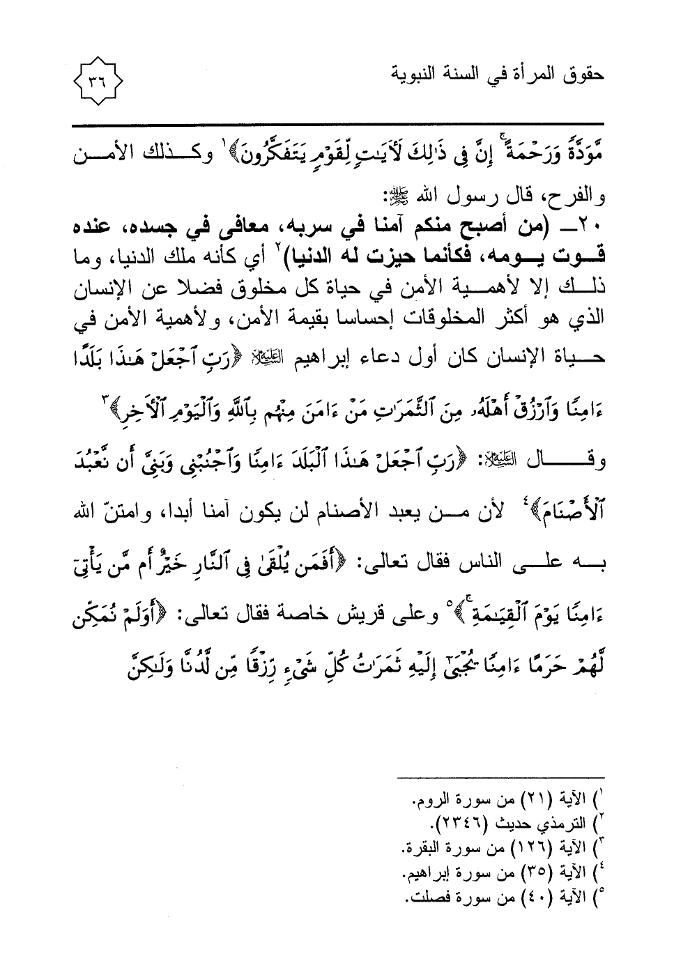 20 - (من أصبح منكم آمنا في سربه، معافى في جسده، عنده قوت يومه، فكأنما حيزت له الدنيا) (¬2) أي كأنه ملك الدنيا، وما ذلك إلا لأهمية الأمن في حياة كل مخلوق فضلا عن الإنسان الذي هو أكثر المخلوقات إحساسا بقيمة الأمن، ولأهمية الأمن في حياة الإنسان كان أول دعاء إبراهيم - عليه السلام - {رَبِّ اجْعَلْ هَذَا بَلَدًا آمِنًا وَارْزُقْ أَهْلَهُ مِنَ الثَّمَرَاتِ مَنْ آمَنَ مِنْهُمْ بِاللَّهِ وَالْيَوْمِ الْآخِرِ} (¬3) وقال - عليه السلام -: {وَإِذْ قَالَ إِبْرَاهِيمُ رَبِّ اجْعَلْ هَذَا الْبَلَدَ آمِنًا وَاجْنُبْنِي وَبَنِيَّ أَنْ نَعْبُدَ الْأَصْنَامَ} (¬4) لأن من يعبد الأصنام لن يكون آمنا أبدا، وامتنّ الله به على الناس فقال تعالى: {أَفَمَنْ يُلْقَى فِي النَّارِ خَيْرٌ أَمْ مَنْ يَأْتِي آمِنًا يَوْمَ الْقِيَامَةِ} (¬5) وعلى قريش خاصة فقال تعالى: {أَوَلَمْ نُمَكِّنْ لَهُمْ حَرَمًا آمِنًا يُجْبَى إِلَيْهِ ثَمَرَاتُ كُلِّ شَيْءٍ رِزْقًا مِنْ لَدُنَّا وَلَكِنَّ