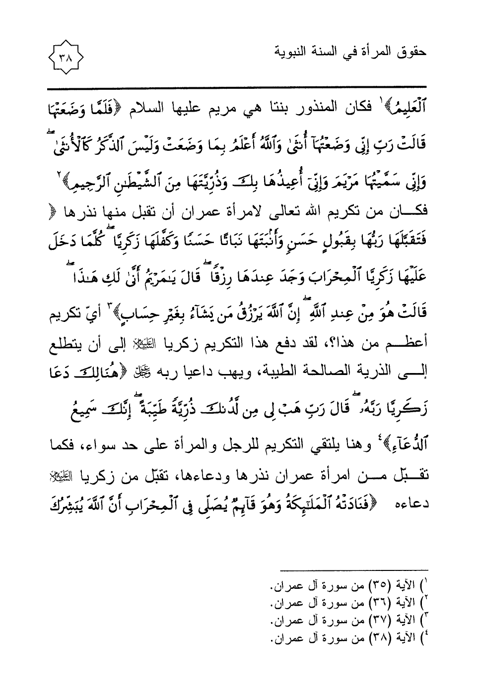 الْعَلِيمُ} (¬1) فكان المنذور بنتا هي مريم عليها السلام {فَلَمَّا وَضَعَتْهَا قَالَتْ رَبِّ إِنِّي وَضَعْتُهَا أُنْثَى وَاللَّهُ أَعْلَمُ بِمَا وَضَعَتْ وَلَيْسَ الذَّكَرُ كَالْأُنْثَى وَإِنِّي سَمَّيْتُهَا مَرْيَمَ وَإِنِّي أُعِيذُهَا بِكَ وَذُرِّيَّتَهَا مِنَ الشَّيْطَانِ الرَّجِيمِ} (¬2) فكان من تكريم الله تعالى لامرأة عمران أن تقبل منها نذرها {فَتَقَبَّلَهَا رَبُّهَا بِقَبُولٍ حَسَنٍ وَأَنْبَتَهَا نَبَاتًا حَسَنًا وَكَفَّلَهَا زَكَرِيَّا كُلَّمَا دَخَلَ عَلَيْهَا زَكَرِيَّا الْمِحْرَابَ وَجَدَ عِنْدَهَا رِزْقًا قَالَ يَامَرْيَمُ أَنَّى لَكِ هَذَا قَالَتْ هُوَ مِنْ عِنْدِ اللَّهِ إِنَّ اللَّهَ يَرْزُقُ مَنْ يَشَاءُ بِغَيْرِ حِسَابٍ} (¬3) أيّ تكريم أعظم من هذا؟ ، لقد دفع هذا التكريم زكريا - عليه السلام - إلى أن يتطلع إلى الذرية الصالحة الطيبة، ويهب داعيا ربه - عز وجل - {هُنَالِكَ دَعَا زَكَرِيَّا رَبَّهُ قَالَ رَبِّ هَبْ لِي مِنْ لَدُنْكَ ذُرِّيَّةً طَيِّبَةً إِنَّكَ سَمِيعُ الدُّعَاءِ} (¬4) وهنا يلتقي التكريم للرجل والمرأة على حد سواء، فكما تقبّل من امرأة عمران نذرها ودعاءها، تقبّل من زكريا - عليه السلام - دعاءه {فَنَادَتْهُ الْمَلَائِكَةُ وَهُوَ قَائِمٌ يُصَلِّي فِي الْمِحْرَابِ أَنَّ اللَّهَ يُبَشِّرُكَ