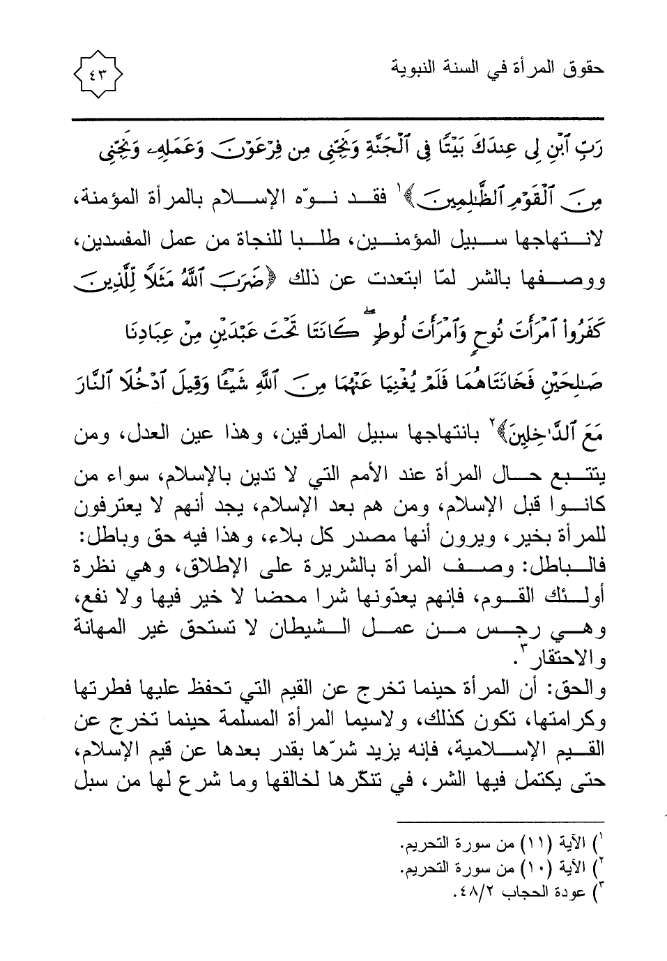 رَبِّ ابْنِ لِي عِنْدَكَ بَيْتًا فِي الْجَنَّةِ وَنَجِّنِي مِنْ فِرْعَوْنَ وَعَمَلِهِ وَنَجِّنِي مِنَ الْقَوْمِ الظَّالِمِينَ} (¬1) فقد نوّه الإسلام بالمرأة المؤمنة، لانتهاجها سبيل المؤمنين، طلبا للنجاة من عمل المفسدين، ووصفها بالشر لمّا ابتعدت عن ذلك {ضَرَبَ اللَّهُ مَثَلًا لِلَّذِينَ كَفَرُوا امْرَأَتَ نُوحٍ وَامْرَأَتَ لُوطٍ كَانَتَا تَحْتَ عَبْدَيْنِ مِنْ عِبَادِنَا صَالِحَيْنِ فَخَانَتَاهُمَا فَلَمْ يُغْنِيَا عَنْهُمَا مِنَ اللَّهِ شَيْئًا وَقِيلَ ادْخُلَا النَّارَ مَعَ الدَّاخِلِينَ} (¬2) بانتهاجها سبيل المارقين، وهذا عين العدل، ومن يتتبع حال المرأة عند الأمم التي لا تدين بالإسلام، سواء من كانوا قبل الإسلام، ومن هم بعد الإسلام، يجد أنهم لا يعترفون للمرأة بخير، ويرون أنها مصدر كل بلاء، وهذا فيه حق وباطل: