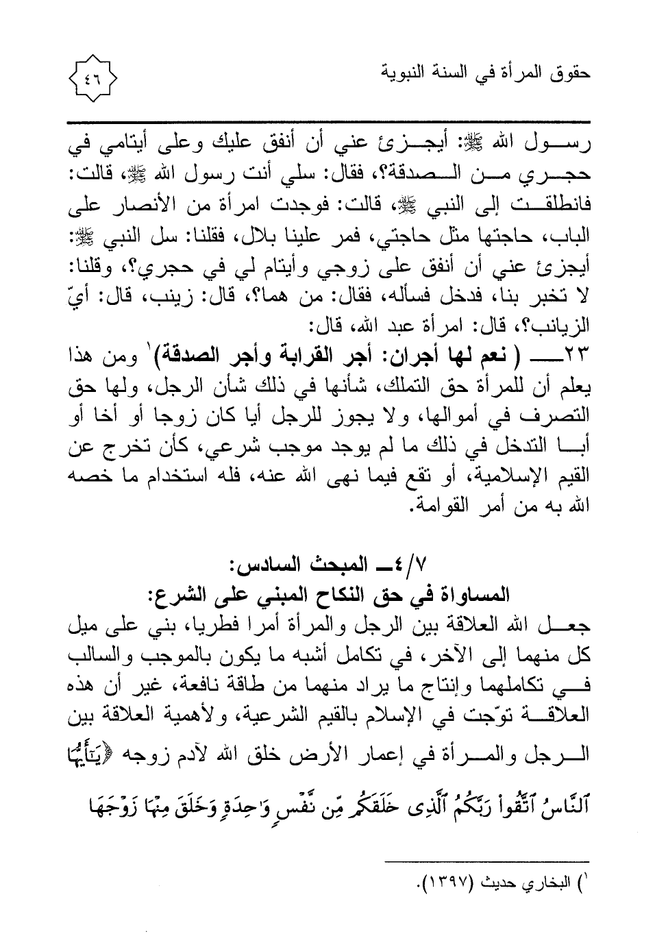 23 - (نعم لها أجران: أجر القرابة وأجر الصدقة) (¬1) ومن هذا يعلم أن للمرأة حق التملك، شأنها في ذلك شأن الرجل، ولها حق التصرف في أموالها، ولا يجوز للرجل أيا كان زوجا أو أخا أو أبا التدخل في ذلك ما لم يوجد موجب شرعي، كأن تخرج عن القيم الإسلامية، أو تقع فيما نهى الله عنه، فله استخدام ما خصه الله به من أمر القوامة.