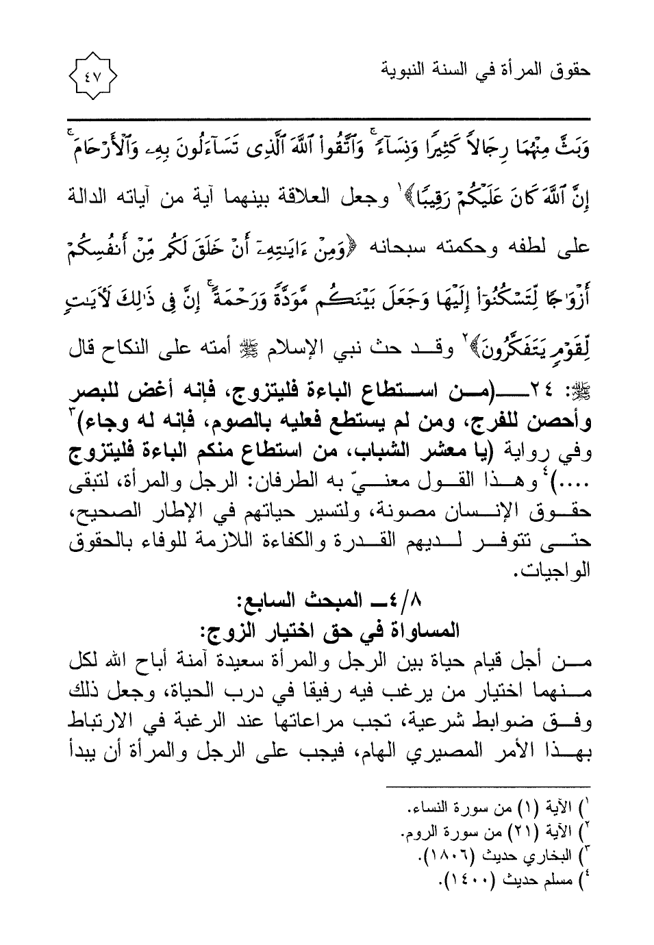 24 - (من استطاع الباءة فليتزوج، فإنه أغض للبصر وأحصن للفرج، ومن لم يستطع فعليه بالصوم، فإنه له وجاء) (¬3) وفي رواية (يا معشر الشباب، من استطاع منكم الباءة فليتزوج. . . .) (¬4) وهذا القول معنيّ به الطرفان: الرجل والمرأة، لتبقى حقوق الإنسان مصونة، ولتسير حياتهم في الإطار الصحيح، حتى تتوفر لديهم القدرة والكفاءة اللازمة للوفاء بالحقوق الواجيات.