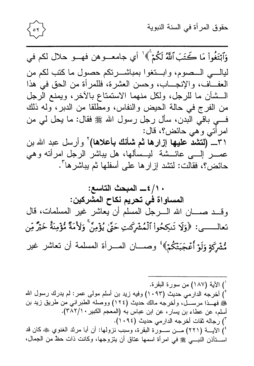 31 - (لتشد عليها إزارها ثم شأنك بأعلاها) (¬2) وأرسل عبد الله بن عمر إلى عائشة ليسألها، هل يباشر الرجل امرأته وهي حائض؟ ، فقالت: لتشد إزارها على أسفلها ثم يباشرها (¬3).