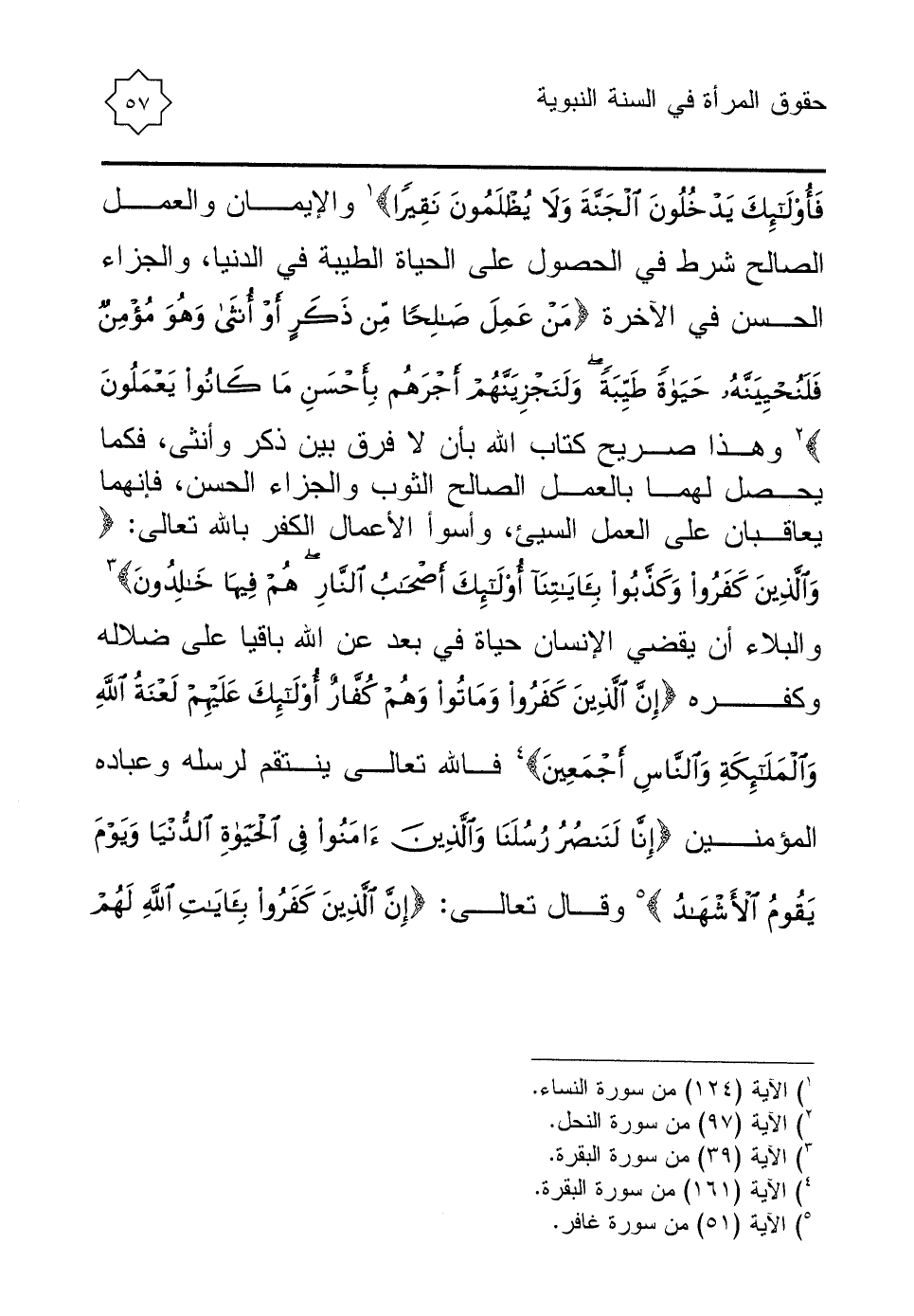 فَأُولَئِكَ يَدْخُلُونَ الْجَنَّةَ وَلَا يُظْلَمُونَ نَقِيرًا} (¬1) والإيمان والعمل الصالح شرط في الحصول على الحياة الطيبة في الدنيا، والجزاء الحسن في الآخرة {مَنْ عَمِلَ صَالِحًا مِنْ ذَكَرٍ أَوْ أُنْثَى وَهُوَ مُؤْمِنٌ فَلَنُحْيِيَنَّهُ حَيَاةً طَيِّبَةً وَلَنَجْزِيَنَّهُمْ أَجْرَهُمْ بِأَحْسَنِ مَا كَانُوا يَعْمَلُونَ} (¬2) وهذا صريح كتاب الله بأن لا فرق بين ذكر وأنثى، فكما يحصل لهما بالعمل الصالح الثوب والجزاء الحسن، فإنهما يعاقبان على العمل السيئ، وأسوأ الأعمال الكفر بالله تعالى: {وَالَّذِينَ كَفَرُوا وَكَذَّبُوا بِآيَاتِنَا أُولَئِكَ أَصْحَابُ النَّارِ هُمْ فِيهَا خَالِدُونَ} (¬3) والبلاء أن يقضي الإنسان حياة في بعد عن الله باقيا على ضلاله وكفره {إِنَّ الَّذِينَ كَفَرُوا وَمَاتُوا وَهُمْ كُفَّارٌ أُولَئِكَ عَلَيْهِمْ لَعْنَةُ اللَّهِ وَالْمَلَائِكَةِ وَالنَّاسِ أَجْمَعِينَ} (¬4) فالله تعالى ينتقم لرسله وعباده المؤمنين {إِنَّا لَنَنْصُرُ رُسُلَنَا وَالَّذِينَ آمَنُوا فِي الْحَيَاةِ الدُّنْيَا وَيَوْمَ يَقُومُ الْأَشْهَادُ} (¬5) وقال تعالى: {إِنَّ الَّذِينَ كَفَرُوا بِآيَاتِ اللَّهِ لَهُمْ