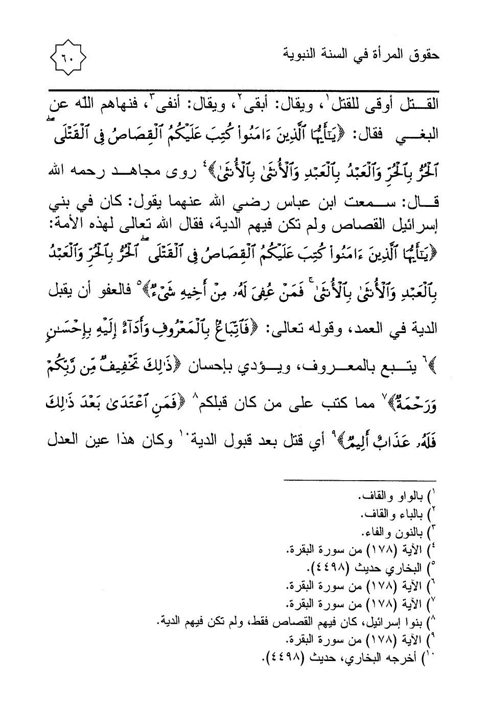 القتل أوقى للقتل (¬1)، ويقال: أبقى (¬2)، ويقال: أنفى (¬3)، فنهاهم الله عن البغي فقال: {يَاأَيُّهَا الَّذِينَ آمَنُوا كُتِبَ عَلَيْكُمُ الْقِصَاصُ فِي الْقَتْلَى الْحُرُّ بِالْحُرِّ وَالْعَبْدُ بِالْعَبْدِ وَالْأُنْثَى بِالْأُنْثَى} (¬4) روى مجاهد رحمه الله قال: سمعت ابن عباس رضي الله عنهما يقول: كان في بني إسرائيل القصاص ولم تكن فيهم الدية، فقال الله تعالى لهذه الأمة: {يَاأَيُّهَا الَّذِينَ آمَنُوا كُتِبَ عَلَيْكُمُ الْقِصَاصُ فِي الْقَتْلَى الْحُرُّ بِالْحُرِّ وَالْعَبْدُ بِالْعَبْدِ وَالْأُنْثَى بِالْأُنْثَى فَمَنْ عُفِيَ لَهُ مِنْ أَخِيهِ شَيْءٌ} (¬5) فالعفو أن يقبل الدية في العمد، وقوله تعالى: {فَاتِّبَاعٌ بِالْمَعْرُوفِ وَأَدَاءٌ إِلَيْهِ بِإِحْسَانٍ} (¬6) يتبع بالمعروف، ويؤدي بإحسان {ذَلِكَ تَخْفِيفٌ مِنْ رَبِّكُمْ وَرَحْمَةٌ} (¬7) مما كتب على من كان قبلكم (¬8) {فَمَنِ اعْتَدَى بَعْدَ ذَلِكَ فَلَهُ عَذَابٌ أَلِيمٌ} (¬9) أي قتل بعد قبول الدية (¬10) وكان هذا عين العدل