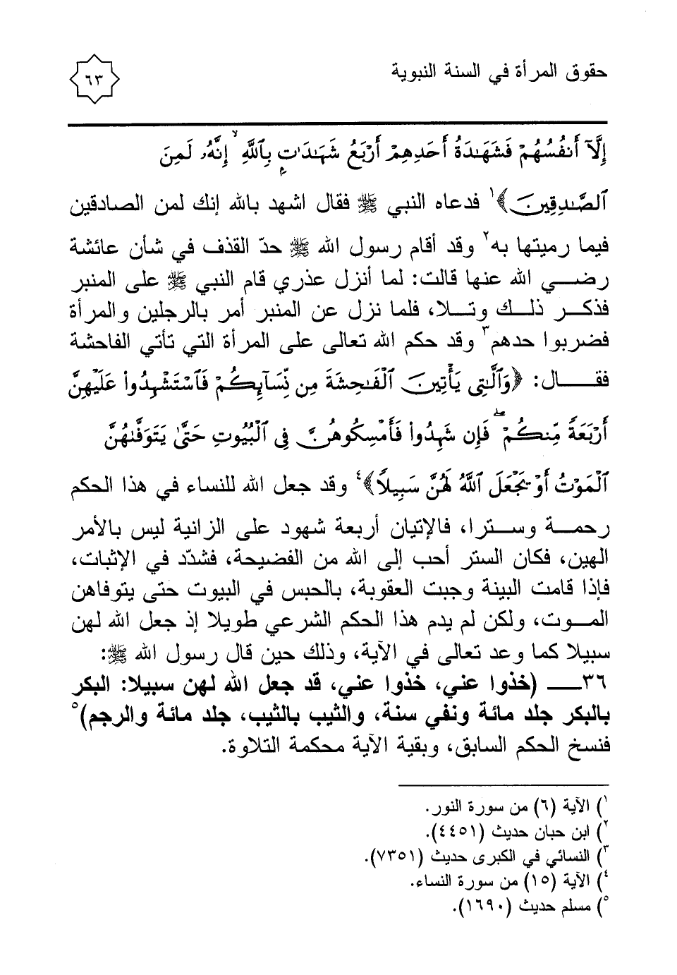 إِلَّا أَنْفُسُهُمْ فَشَهَادَةُ أَحَدِهِمْ أَرْبَعُ شَهَادَاتٍ بِاللَّهِ إِنَّهُ لَمِنَ الصَّادِقِينَ} (¬1) فدعاه النبي - صلى الله عليه وسلم - فقال اشهد بالله إنك لمن الصادقين فيما رميتها به (¬2) وقد أقام رسول الله - صلى الله عليه وسلم - حدّ القذف في شأن عائشة رضي الله عنها قالت: لما أنزل عذري قام النبي - صلى الله عليه وسلم - على المنبر فذكر ذلك وتلا، فلما نزل عن المنبر أمر بالرجلين والمرأة فضربوا حدهم (¬3) وقد حكم الله تعالى على المرأة التي تأتي الفاحشة فقال: {وَاللَّاتِي يَأْتِينَ الْفَاحِشَةَ مِنْ نِسَائِكُمْ فَاسْتَشْهِدُوا عَلَيْهِنَّ أَرْبَعَةً مِنْكُمْ فَإِنْ شَهِدُوا فَأَمْسِكُوهُنَّ فِي الْبُيُوتِ حَتَّى يَتَوَفَّاهُنَّ الْمَوْتُ أَوْ يَجْعَلَ اللَّهُ لَهُنَّ سَبِيلًا} (¬4) وقد جعل الله للنساء في هذا الحكم رحمة وسترا، فالإتيان أربعة شهود على الزانية ليس بالأمر الهين، فكان الستر أحب إلى الله من الفضيحة، فشدّد في الإثبات، فإذا قامت البينة وجبت العقوبة، بالحبس في البيوت حتى يتوفاهن الموت، ولكن لم يدم هذا الحكم الشرعي طويلا إذ جعل الله لهن سبيلا كما وعد تعالى في الآية، وذلك حين قال رسول الله - صلى الله عليه وسلم -: