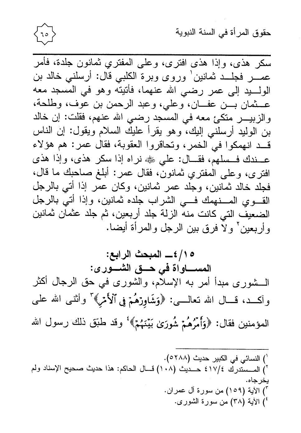 الشورى مبدأ أمر به الإسلام، والشورى في حق الرجال أكثر وآكد، قال الله تعالى: {وَشَاوِرْهُمْ فِي الْأَمْرِ} (¬3)، أثنى الله - عز وجل - على المؤمنين فقال: {وَأَمْرُهُمْ شُورَى بَيْنَهُمْ} (¬4)، وقد طبّق ذلك رسول الله