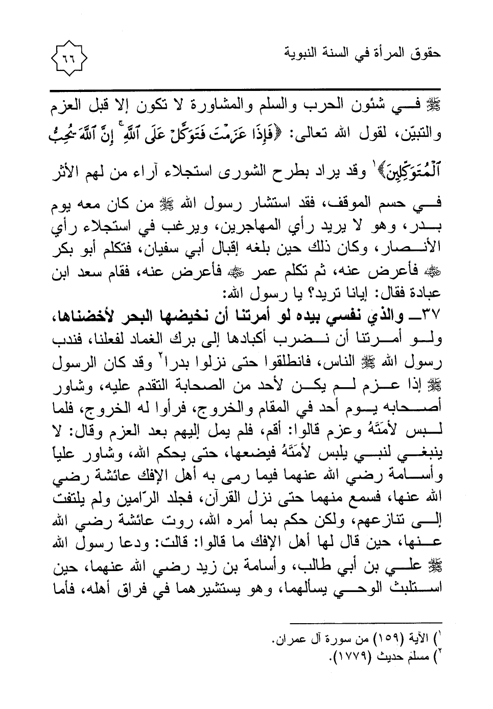 37 - "والذي نفسي بيده لو أمرتنا أن نخيضها البحر لأخضناها، ولو أمرتنا أن نضرب أكبادها إلى برك الغماد لفعلنا" فندب رسول الله - صلى الله عليه وسلم - الناس، فانطلقوا حتى نزلوا بدرا (¬2) وقد كان الرسول - صلى الله عليه وسلم - إذا عزم لم يكن لأحد من الصحابة التقدم عليه، وشاور أصحابه يوم أحد في المقام والخروج، فرأوا له الخروج، فلما لبس لأمَتَهُ وعزم قالوا: أقم، فلم يمل إليهم بعد العزم وقال: لا ينبغي لنبي يلبس لأمَتَهُ فيضعها، حتى يحكم الله، وشاور علياً وأسامة رضي الله عنهما فيما رمى به أهل الإفك عائشة رضي الله عنها، فسمع منهما حتى نزل القرآن، فجلد الرّامين ولم يلتفت إلى تنازعهم، ولكن حكم بما أمره الله، روت عائشة رضي الله عنها، حين قال لها أهل الإفك ما قالوا: قالت: ودعا رسول الله - صلى الله عليه وسلم - علي بن أبي طالب، وأسامة بن زيد رضي الله عنهما، حين استلبث الوحي يسألهما، وهو يستشيرهما في فراق أهله، فأما