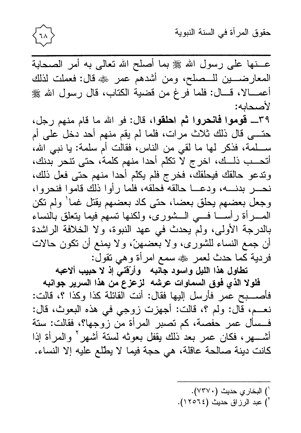 39 - قوموا فانحروا ثم احلقوا، قال: فو الله ما قام منهم رجل، حتى قال ذلك ثلاث مرات، فلما لم يقم منهم أحد دخل على أم سلمة، فذكر لها ما لقي من الناس، فقالت أم سلمة: يا نبي الله، أتحب ذلك، اخرج لا تكلّم أحدا منهم كلمة، حتى تنحر بدنك، وتدعو حالقك فيحلقك، فخرج فلم يكلّم أحدا منهم حتى فعل ذلك، نحر بدنه، ودعا حالقه فحلقه، فلما رأوا ذلك قاموا فنحروا، وجعل بعضهم يحلق بعضا، حتى كاد بعضهم يقتل غما (¬1) ولم تكن المرأة رأسا في الشورى، ولكنها تسهم فيما يتعلق بالنساء بالدرجة الأولى، ولم يحدث في عهد النبوة، ولا الخلافة الراشدة أن جمع النساء للشورى، ولا بعضهنّ، ولا يمنع أن تكون حالات فردية كما حدث لعمر - رضي الله عنه - سمع امرأة وهي تقول: