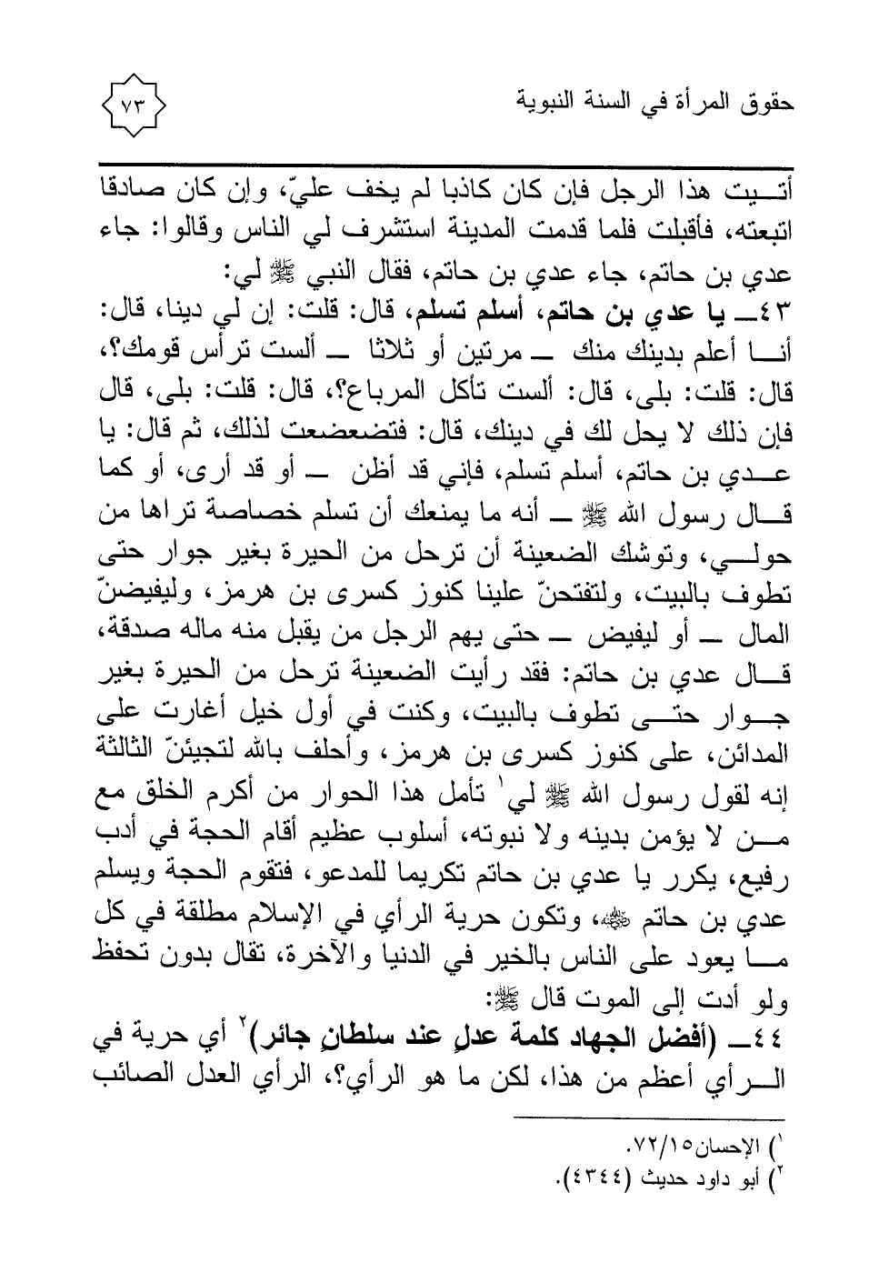 43 - يا عدي بن حاتم، أسلم تسلم، قال: قلت: إن لي دينا، قال: أنا أعلم بدينك منك - مرتين أو ثلاثا - ألست ترأس قومك؟ ، قال: قلت: بلى، قال: ألست تأكل المرباع؟ ، قال: قلت: بلى، قال فإن ذلك لا يحل لك في دينك، قال: فتضعضعت لذلك، ثم قال: يا عدي بن حاتم، أسلم تسلم، فإني قد أظن - أو قد أرى، أو كما قال رسول الله - صلى الله عليه وسلم - - أنه ما يمنعك أن تسلم خصاصة تراها من حولي، وتوشك الضعينة أن ترحل من الحيرة بغير جوار حتى تطوف بالبيت، ولتفتحنّ علينا كنوز كسرى بن هرمز، وليفيضنّ المال - أو ليفيض - حتى يهم الرجل من يقبل منه ماله صدقة، قال عدي بن حاتم: فقد رأيت الضعينة ترحل من الحيرة بغير جوار حتى تطوف بالبيت، وكنت في أول خيل أغارت على المدائن، على كنوز كسرى بن هرمز، وأحلف بالله لتجيئنّ الثالثة إنه لقول رسول الله - صلى الله عليه وسلم - لي (¬1) تأمل هذا الحوار من أكرم الخلق مع من لا يؤمن بدينه ولا نبوته، أسلوب عظيم أقام الحجة في أدب رفيع، يكرر يا عدي بن حاتم تكريما للمدعو، فتقوم الحجة ويسلم عدي بن حاتم - رضي الله عنه -، وتكون حرية الرأي في الإسلام مطلقة في كل ما يعود على الناس بالخير في الدنيا والآخرة، تقال بدون تحفظ ولو أدت إلى الموت قال - صلى الله عليه وسلم -: