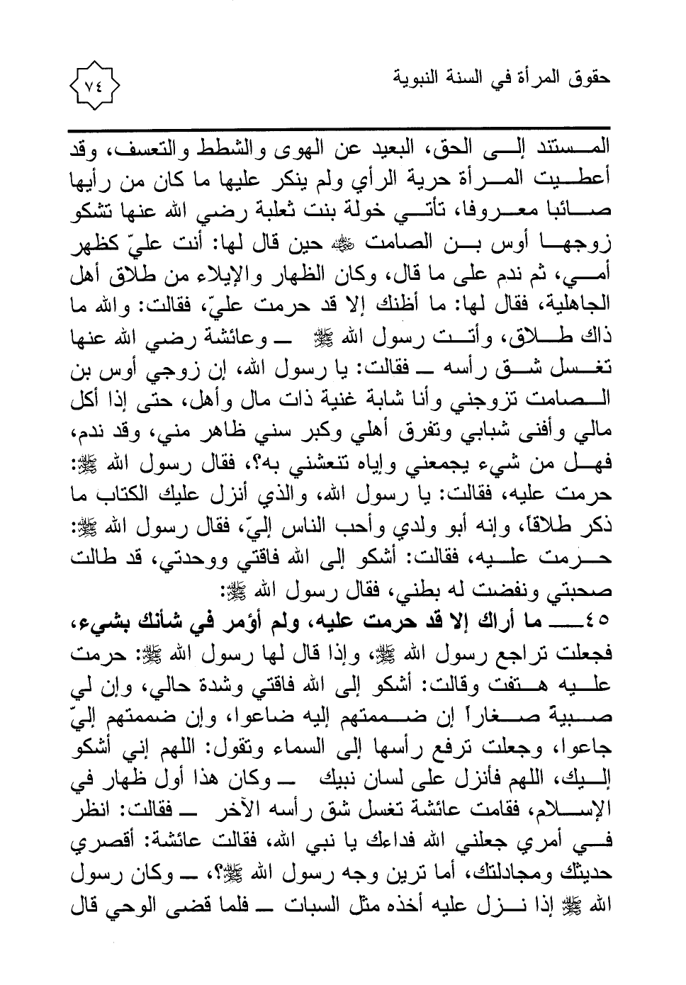 المستند إلى الحق، البعيد عن الهوى والشطط والتعسف، وقد أعطيت المرأة حرية الرأي ولم ينكر عليها ما كان من رأيها صائبا معروفا، تأتي خولة بنت ثعلبة رضي الله عنها تشكو زوجها أوس بن الصامت - رضي الله عنه - حين قال لها: أنت عليّ كظهر أمي، ثم ندم على ما قال، وكان الظهار والإيلاء من طلاق أهل الجاهلية، فقال لها: ما أظنك إلا قد حرمت عليّ، فقالت: والله ما ذاك طلاق، وأتت رسول الله - صلى الله عليه وسلم - - وعائشة رضي الله عنها تغسل شق رأسه - فقالت: يا رسول الله، إن زوجي أوس بن الصامت تزوجني وأنا شابة غنية ذات مال وأهل، حتى إذا أكل مالي وأفنى شبابي وتفرق أهلي وكبر سني ظاهر مني، وقد ندم، فهل من شيء يجمعني وإياه تنعشني به؟ ، فقال رسول الله - صلى الله عليه وسلم -: حرمت عليه، فقالت: يا رسول الله، والذي أنزل عليك الكتاب ما ذكر طلاقاً، وإنه أبو ولدي وأحب الناس إليّ، فقال رسول الله - صلى الله عليه وسلم -: حرمت عليه، فقالت: أشكو إلى الله فاقتي ووحدتي، قد طالت صحبتي ونفضت له بطني، فقال رسول الله - صلى الله عليه وسلم -: