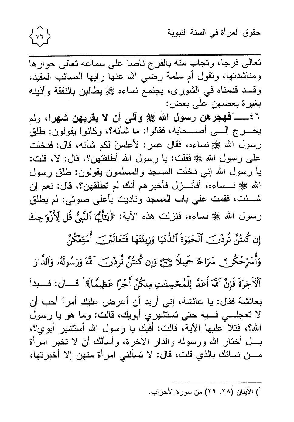 46 - فهجرهن رسول الله - صلى الله عليه وسلم - وآلى أن لا يقربهن شهرا، ولم يخرج إلى أصحابه، فقالوا: ما شأنه؟ ، وكانوا يقولون: طلق رسول الله - صلى الله عليه وسلم - نساءه، فقال عمر: لأعلمنّ لكم شأنه، قال: فدخلت على رسول الله - صلى الله عليه وسلم - فقلت: يا رسول الله أطلقتهن؟ ، قال: لا، قلت: يا رسول الله إني دخلت المسجد والمسلمون يقولون: طلّق رسول الله - صلى الله عليه وسلم - نساءه، أفأنزل فأخبرهم أنك لم تطلقهن؟ ، قال: نعم إن شئت، فقمت على باب المسجد وناديت بأعلى صوتي: لم يطلق رسول الله - صلى الله عليه وسلم - نساءه، فنزلت هذه الآية: {يَاأَيُّهَا النَّبِيُّ قُلْ لِأَزْوَاجِكَ إِنْ كُنْتُنَّ تُرِدْنَ الْحَيَاةَ الدُّنْيَا وَزِينَتَهَا فَتَعَالَيْنَ أُمَتِّعْكُنَّ وَأُسَرِّحْكُنَّ سَرَاحًا جَمِيلًا (28) وَإِنْ كُنْتُنَّ تُرِدْنَ اللَّهَ وَرَسُولَهُ وَالدَّارَ الْآخِرَةَ فَإِنَّ اللَّهَ أَعَدَّ لِلْمُحْسِنَاتِ مِنْكُنَّ أَجْرًا عَظِيمًا} (¬1) قال: فبدأ بعائشة فقال: يا عائشة، إني أريد أن أعرض عليك أمراً أحب أن لا تعجلي فيه حتى تستشيري أبويك، قالت: وما هو يا رسول الله؟ ، فتلا عليها الآية، قالت: أفيك يا رسول الله أستشير أبوي؟ ، بل أختار الله ورسوله والدار الآخرة، وأسألك أن لا تخبر امرأة من نسائك بالذي قلت، قال: لا تسألني امرأة منهن إلا أخبرتها،