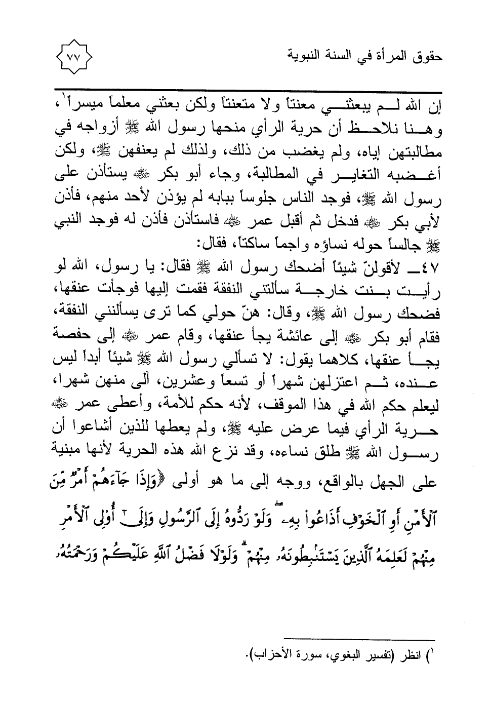47 - "لأقولن شيئاً أضحك رسول الله - صلى الله عليه وسلم - فقال: يا رسول، الله لو رأيت بنت خارجة سألتني النفقة فقمت إليها فوجأت عنقها، فضحك رسول الله - صلى الله عليه وسلم -، وقال: هنّ حولي كما ترى يسألنني النفقة، فقام أبو بكر - رضي الله عنه - إلى عائشة يجأ عنقها، وقام عمر - رضي الله عنه - إلى حفصة يجأ عنقها، كلاهما يقول: لا تسألي رسول الله - صلى الله عليه وسلم - شيئاً أبداً ليس عنده، ثم اعتزلهن شهراً أو تسعاً وعشرين، آلى منهن شهرا" ليعلم حكم الله في هذا الموقف، لأنه حكم للأمة، وأعطى عمر - رضي الله عنه - حرية الرأي فيما عرض عليه - صلى الله عليه وسلم -، ولم يعطها للذين أشاعوا أن رسول الله - صلى الله عليه وسلم - طلق نساءه، وقد نزع الله هذه الحرية لأنها مبنية على الجهل بالواقع، ووجه إلى ما هو أولى {وَإِذَا جَاءَهُمْ أَمْرٌ مِنَ الْأَمْنِ أَوِ الْخَوْفِ أَذَاعُوا بِهِ وَلَوْ رَدُّوهُ إِلَى الرَّسُولِ وَإِلَى أُولِي الْأَمْرِ مِنْهُمْ لَعَلِمَهُ الَّذِينَ يَسْتَنْبِطُونَهُ مِنْهُمْ وَلَوْلَا فَضْلُ اللَّهِ عَلَيْكُمْ وَرَحْمَتُهُ