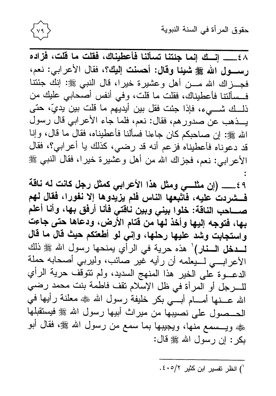 49 - (إن مثلي ومثل هذا الأعرابي كمثل رجل كانت له ناقة فشردت عليه، فاتّبعها الناس فلم يزيدوها إلا نفورا، فقال لهم صاحب الناقة: خلوا بيني وبين ناقتي فأنا أرفق بها، وأنا أعلم بها، فتوجه إليها وأخذ لها من قتام الأرض، ودعاها حتى جاءت واستجابت وشد عليها رحلها، وإني لو أطعتكم حيث قال ما قال لدخل النار) (¬1) هذه حرية في الرأي يمنحها رسول الله - صلى الله عليه وسلم - ذلك الأعرابي ليعلمه أن رأيه غير صائب، وليربي أصحابه حملة الدعوة على الخير هذا المنهج السديد، ولم تتوقف حرية الرأي للرجل أو المرأة في ظل الإسلام تقف فاطمة بنت محمد رضي الله عنها أمام أبي بكر خليفة رسول الله - رضي الله عنه - معلنة رأيها في الحصول على نصيبها من ميراث أبيها رسول الله - صلى الله عليه وسلم - فيستقبلها - رضي الله عنه - ويسمع منها، ويجيبها بما سمع من رسول الله - صلى الله عليه وسلم -، فقال أبو بكر: إن رسول الله - صلى الله عليه وسلم - قال: