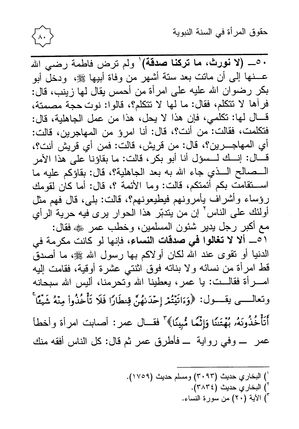 51 - "ألا لا تغالوا في صدقات النساء، فإنها لو كانت مكرمة في الدنيا أو تقوى عند الله لكان أولاكم بها رسول الله - صلى الله عليه وسلم -، ما أصدق قط امرأة من نسائه ولا بناته فوق اثنتي عشرة أوقية، فقامت إليه امرأة فقالت: يا عمر، يعطينا الله وتحرمنا، أليس الله سبحانه وتعالى يقول: {وَإِنْ أَرَدْتُمُ اسْتِبْدَالَ زَوْجٍ مَكَانَ زَوْجٍ وَآتَيْتُمْ إِحْدَاهُنَّ قِنْطَارًا فَلَا تَأْخُذُوا مِنْهُ شَيْئًا أَتَأْخُذُونَهُ بُهْتَانًا وَإِثْمًا مُبِينًا} (¬3) فقال عمر: أصابت امرأة وأخطأ عمر" - وفي رواية - فأطرق عمر ثم قال: كل الناس أفقه منك