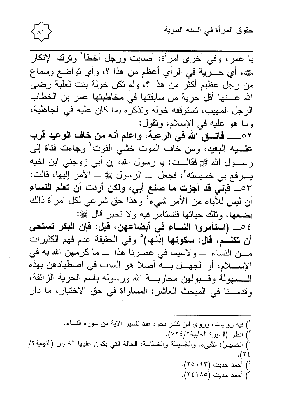54 - (استأمروا النساء في أبضاعهن، قيل: فإن البكر تستحي أن تكلم، قال: سكوتها إذنها) (¬5) وفي الحقيقة عدم فهم الكثيرات من النساء - ولاسيما في عصرنا هذا - ما كرمهن الله به في الإسلام، أو الجهل به أصلا هو السبب في اصطيادهن بهذه السهولة وقبولهن محاربة الله ورسوله باسم الحرية الزائفة، وقدمنا في المبحث العاشر: المساواة في حق الاختيار، ما دار