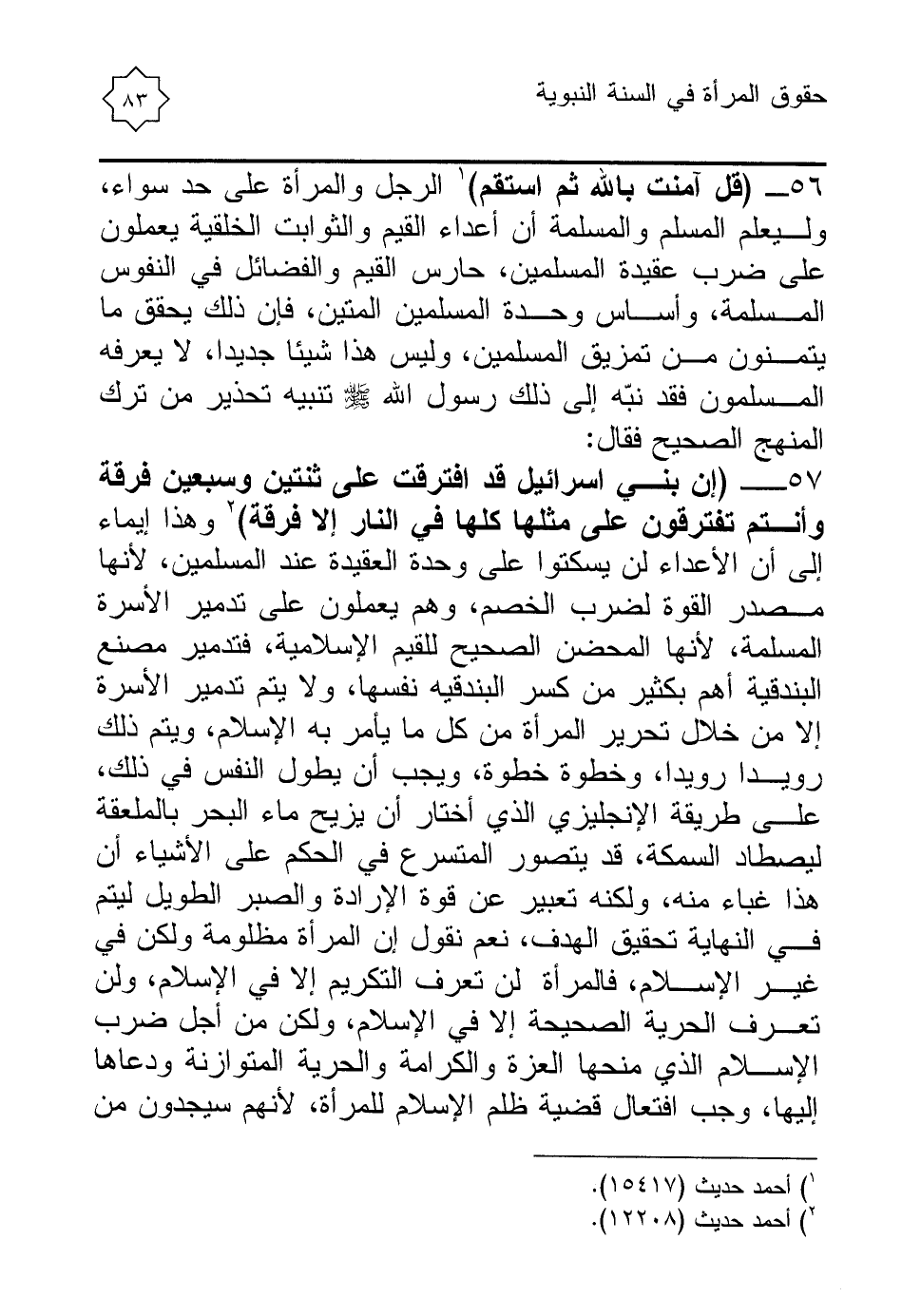 57 - (إن بني اسرائيل قد افترقت على ثنتين وسبعين فرقة وأنتم تفترقون على مثلها كلها في النار إلا فرقة) (¬2) وهذا إيماء إلى أن الأعداء لن يسكتوا على وحدة العقيدة عند المسلمين، لأنها مصدر القوة لضرب الخصم، وهم يعملون على تدمير الأسرة المسلمة، لأنها المحضن الصحيح للقيم الإسلامية، فتدمير مصنع البندقية أهم بكثير من كسر البندقيه نفسها، ولا يتم تدمير الأسرة إلا من خلال تحرير المرأة من كل ما يأمر به الإسلام، ويتم ذلك رويدا رويدا، وخطوة خطوة، ويجب أن يطول النفس في ذلك، على طريقة الإنجليزي الذي أختار أن يزيح ماء البحر بالملعقة ليصطاد السمكة، قد يتصور المتسرع في الحكم على الأشياء أن هذا غباء منه، ولكنه تعبير عن قوة الإرادة والصبر الطويل ليتم في النهاية تحقيق الهدف، نعم نقول إن المرأة مظلومة ولكن في غير الإسلام، فالمرأة لن تعرف التكريم إلا في الإسلام، ولن تعرف الحرية الصحيحة إلا في الإسلام، ولكن من أجل ضرب الإسلام الذي منحها العزة والكرامة والحرية المتوازنة ودعاها إليها، وجب افتعال قضية ظلم الإسلام للمرأة، لأنهم سيجدون من
