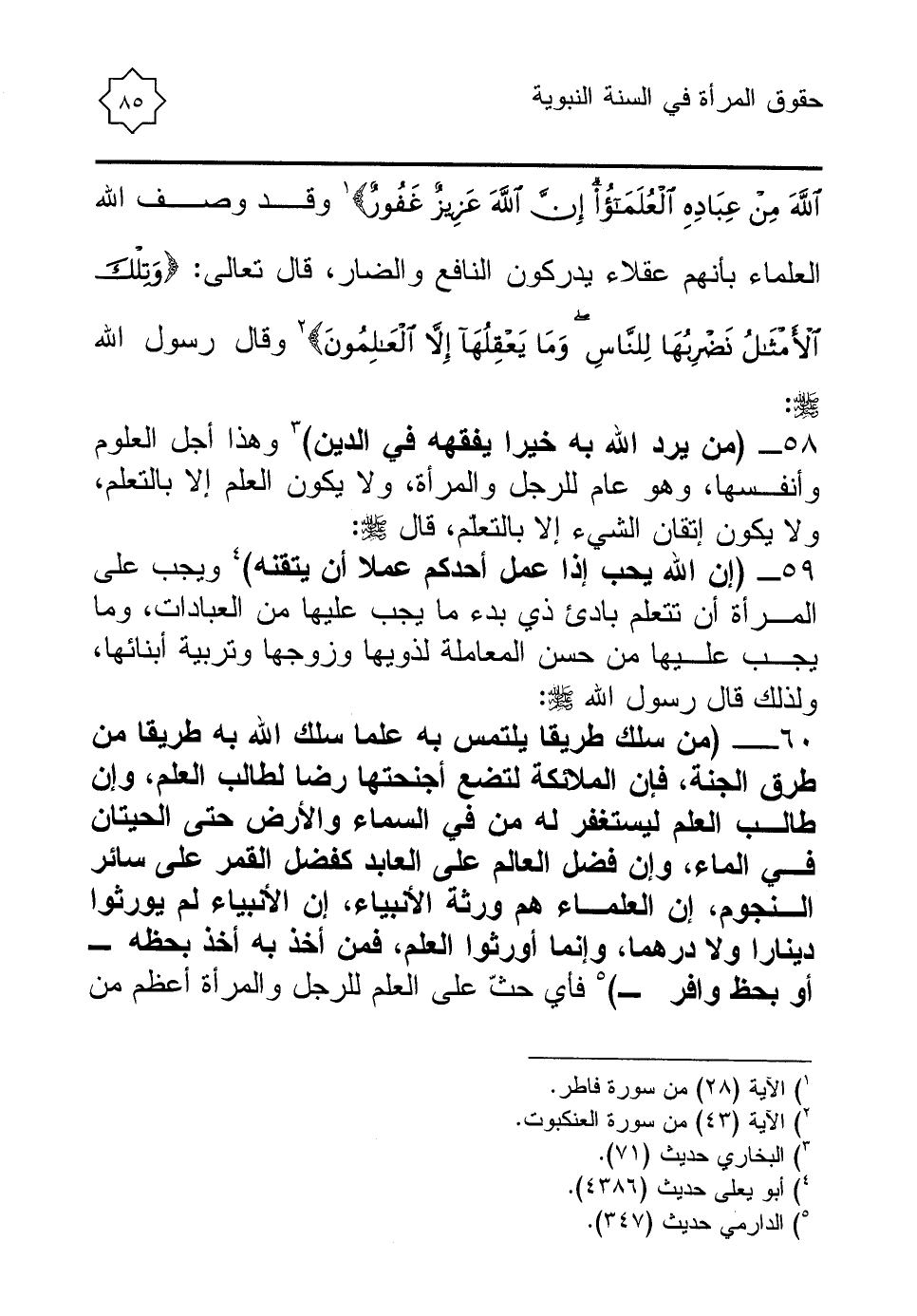 60 - (من سلك طريقا يلتمس به علما سلك الله به طريقا من طرق الجنة، فإن الملائكة لتضع أجنحتها رضا لطالب العلم، وإن طالب العلم ليستغفر له من في السماء والأرض حتى الحيتان في الماء، وإن فضل العالم على العابد كفضل القمر على سائر النجوم، إن العلماء هم ورثة الأنبياء، إن الأنبياء لم يورثوا دينارا ولا درهما، وإنما أورثوا العلم، فمن أخذ به أخذ بحظه - - - - أو بحظ وافر - - -) (¬5) فأي حثّ على العلم للرجل والمرأة أعظم من