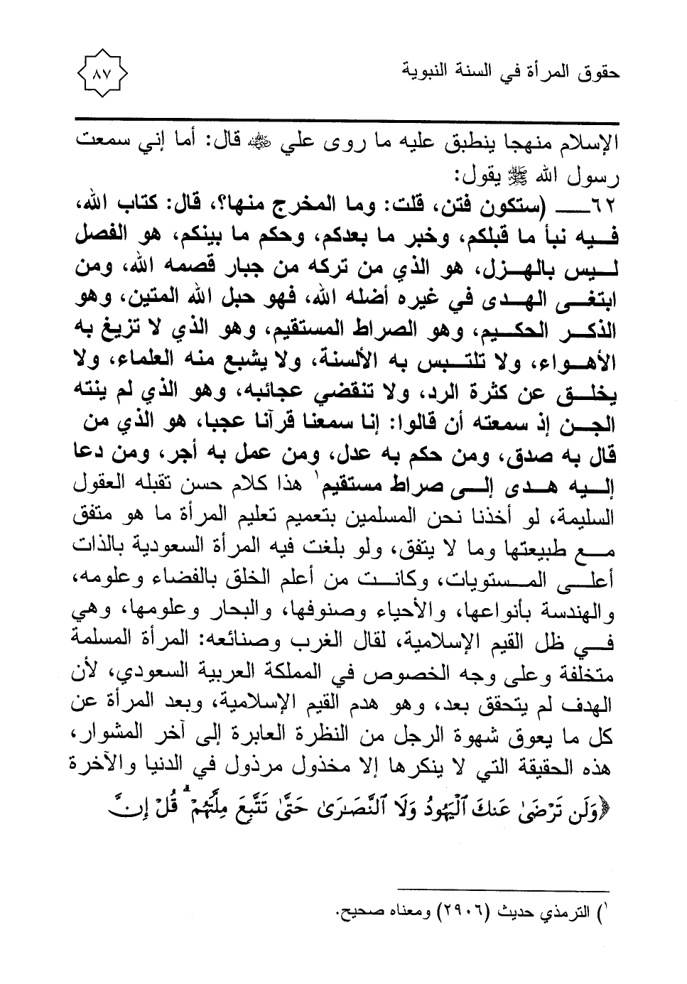 62 - (ستكون فتن، قلت: وما المخرج منها? ، قال: كتاب الله، فيه نبأ ما قبلكم، وخبر ما بعدكم، وحكم ما بينكم، هو الفصل ليس بالهزل، هو الذي من تركه من جبار قصمه الله، ومن ابتغى الهدى في غيره أضله الله، فهو حبل الله المتين، وهو الذكر الحكيم، وهو الصراط المستقيم، وهو الذي لا تزيغ به الأهواء، ولا تلتبس به الألسنة، ولا يشبع منه العلماء، ولا يخلق عن كثرة الرد، ولا تنقضي عجائبه، وهو الذي لم ينته الجن إذ سمعته أن قالوا: إنا سمعنا قرآنا عجبا، هو الذي من قال به صدق، ومن حكم به عدل، ومن عمل به أجر، ومن دعا إليه هدى إلى صراط مستقيم) (¬1) هذا كلام حسن تقبله العقول السليمة، لو أخذنا نحن المسلمين بتعميم تعليم المرأة ما هو متفق مع طبيعتها وما لا يتفق، ولو بلغت فيه المرأة السعودية بالذات أعلى المستويات، وكانت من أعلم الخلق بالفضاء وعلومه، والهندسة بأنواعها، والأحياء وصنوفها، والبحار وعلومها، وهي في ظل القيم الإسلامية، لقال الغرب وصنائعه: المرأة المسلمة متخلفة وعلى وجه الخصوص في المملكة العربية السعودي، لأن الهدف لم يتحقق بعد، وهو هدم القيم الإسلامية، وبعد المرأة عن كل ما يعوق شهوة الرجل من النظرة العابرة إلى آخر المشوار، هذه الحقيقة التي لا ينكرها إلا مخذول مرذول في الدنيا والآخرة {وَلَنْ تَرْضَى عَنْكَ الْيَهُودُ وَلَا النَّصَارَى حَتَّى تَتَّبِعَ مِلَّتَهُمْ قُلْ إِنَّ