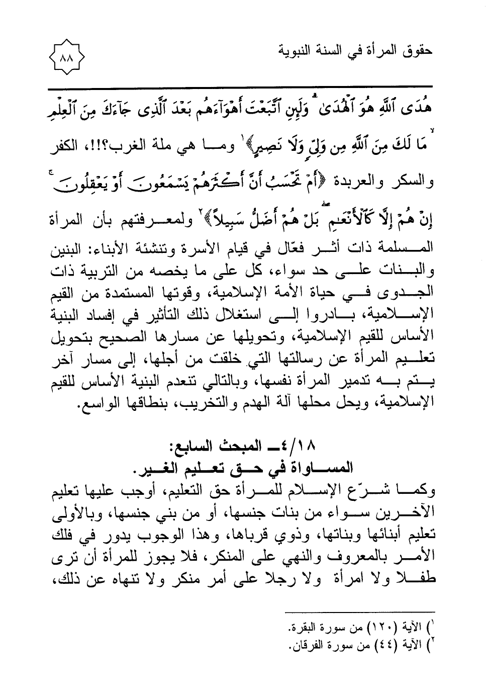 هُدَى اللَّهِ هُوَ الْهُدَى وَلَئِنِ اتَّبَعْتَ أَهْوَاءَهُمْ بَعْدَ الَّذِي جَاءَكَ مِنَ الْعِلْمِ مَا لَكَ مِنَ اللَّهِ مِنْ وَلِيٍّ وَلَا نَصِيرٍ} (¬1) وما هي ملة الغرب؟ ! ! ، الكفر والسكر والعربدة {أَمْ تَحْسَبُ أَنَّ أَكْثَرَهُمْ يَسْمَعُونَ أَوْ يَعْقِلُونَ إِنْ هُمْ إِلَّا كَالْأَنْعَامِ بَلْ هُمْ أَضَلُّ سَبِيلًا} (¬2) ولمعرفتهم بأن المرأة المسلمة ذات أثر فعّال في قيام الأسرة وتنشئة الأبناء: البنين والبنات على حد سواء، كل على ما يخصه من التربية ذات الجدوى في حياة الأمة الإسلامية، وقوتها المستمدة من القيم الإسلامية، بادروا إلى استغلال ذلك التأثير في إفساد البنية الأساس للقيم الإسلامية، وتحويلها عن مسارها الصحيح بتحويل تعليم المرأة عن رسالتها التي خلقت من أجلها، إلى مسار آخر يتم به تدمير المرأة نفسها، وبالتالي تنعدم البنية الأساس للقيم الإسلامية، ويحل محلها آلة الهدم والتخريب، بنطاقها الواسع.