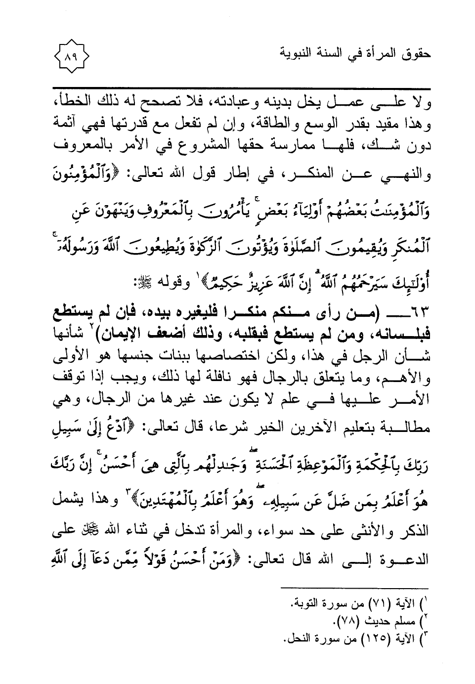 63 - (من رأى منكم منكرا فليغيره بيده، فإن لم يستطع فبلسانه، ومن لم يستطع فبقلبه، وذلك أضعف الإيمان) (¬2) شأنها شأن الرجل في هذا، ولكن اختصاصها ببنات جنسها هو الأولى والأهم، وما يتعلق بالرجال فهو نافلة لها ذلك، ويجب إذا توقف الأمر عليها في علم لا يكون عند غيرها من الرجال، وهي مطالبة بتعليم الآخرين الخير شرعا، قال تعالى: {ادْعُ إِلَى سَبِيلِ رَبِّكَ بِالْحِكْمَةِ وَالْمَوْعِظَةِ الْحَسَنَةِ وَجَادِلْهُمْ بِالَّتِي هِيَ أَحْسَنُ إِنَّ رَبَّكَ هُوَ أَعْلَمُ بِمَنْ ضَلَّ عَنْ سَبِيلِهِ وَهُوَ أَعْلَمُ بِالْمُهْتَدِينَ} (¬3) وهذا يشمل الذكر والأنثى على حد سواء، والمرأة تدخل في ثناء الله - عز وجل - على الدعوة إلى الله قال تعالى: {وَمَنْ أَحْسَنُ قَوْلًا مِمَّنْ دَعَا إِلَى اللَّهِ