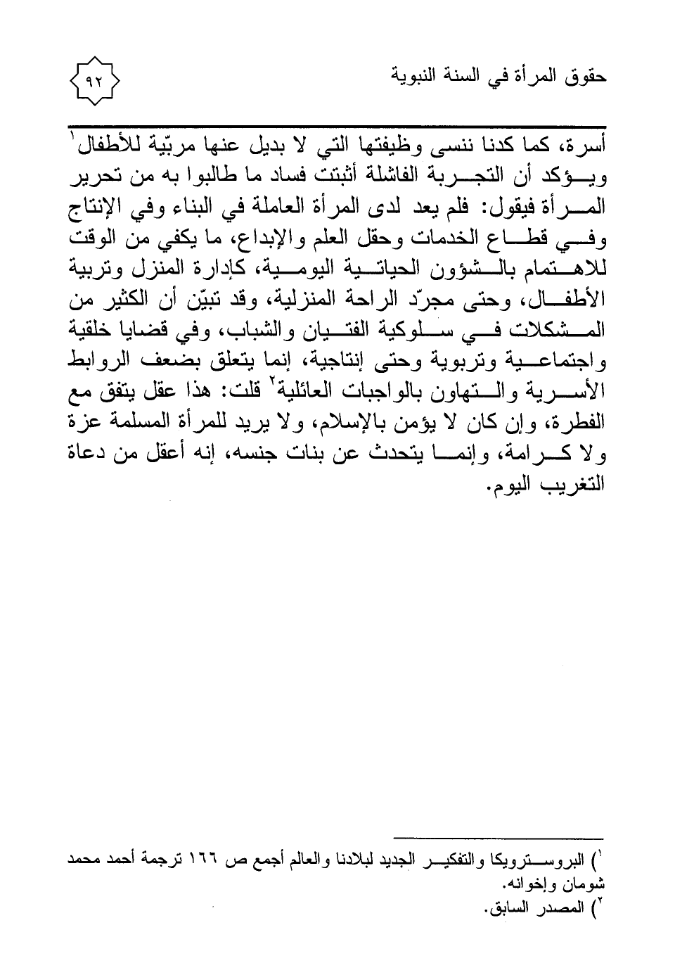 أسرة، كما كدنا ننسى وظيفتها التي لا بديل عنها مربّية للأطفال (¬1) ويؤكد أن التجربة الفاشلة أثبتت فساد ما طالبوا به من تحرير المرأة فيقول: فلم يعد لدى المرأة العاملة في البناء وفي الإنتاج وفي قطاع الخدمات وحقل العلم والإبداع، ما يكفي من الوقت للاهتمام بالشؤون الحياتية اليومية، كإدارة المنزل وتربية الأطفال، وحتى مجرّد الراحة المنزلية، وقد تبيّن أن الكثير من المشكلات في سلوكية الفتيان والشباب، وفي قضايا خلقية واجتماعية وتربوية وحتى إنتاجية، إنما يتعلق بضعف الروابط الأسرية والتهاون بالواجبات العائلية (¬2) قلت: هذا عقل يتفق مع الفطرة، وإن كان لا يؤمن بالإسلام، ولا يريد للمرأة المسلمة عزة ولا كرامة، وإنما يتحدث عن بنات جنسه، إنه أعقل من دعاة التغريب اليوم.