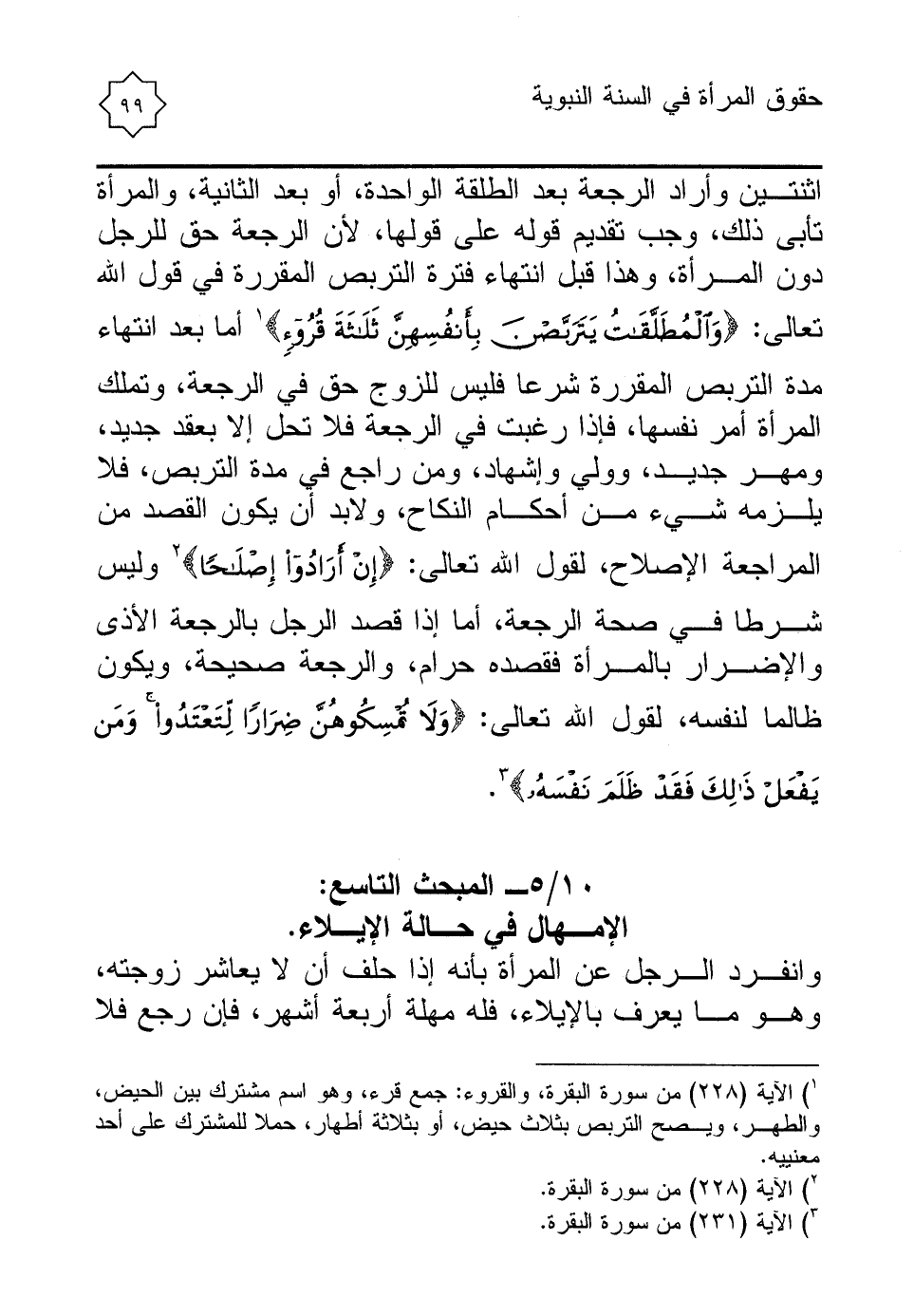 اثنتين وأراد الرجعة بعد الطلقة الواحدة، أو بعد الثانية، والمرأة تأبى ذلك، وجب تقديم قوله على قولها، لأن الرجعة حق للرجل دون المرأة، وهذا قبل انتهاء فترة التربص المقررة في قول الله تعالى: {وَالْمُطَلَّقَاتُ يَتَرَبَّصْنَ بِأَنْفُسِهِنَّ ثَلَاثَةَ قُرُوءٍ} (¬1) أما بعد انتهاء مدة التربص المقررة شرعا فليس للزوج حق في الرجعة، وتملك المرأة أمر نفسها، فإذا رغبت في الرجعة فلا تحل إلا بعقد جديد، ومهر جديد، وولي وإشهاد، ومن راجع في مدة التربص، فلا يلزمه شيء من أحكام النكاح، ولابد أن يكون القصد من المراجعة الإصلاح، لقول الله تعالى: {إِنْ أَرَادُوا إِصْلَاحًا} (¬2) وليس شرطا في صحة الرجعة، أما إذا قصد الرجل بالرجعة الأذى والإضرار بالمرأة فقصده حرام، والرجعة صحيحة، ويكون ظالما لنفسه، لقول الله تعالى: {وَلَا تُمْسِكُوهُنَّ ضِرَارًا لِتَعْتَدُوا وَمَنْ يَفْعَلْ ذَلِكَ فَقَدْ ظَلَمَ نَفْسَهُ} (¬3).