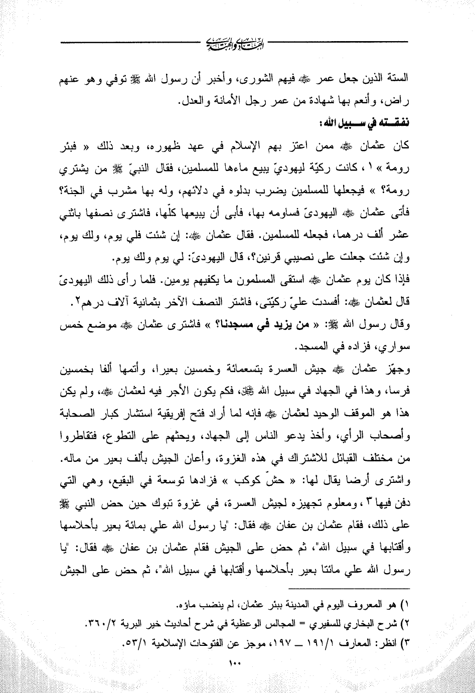 وجهّز عثمان - رضي الله عنه - جيش العسرة بتسعمائة وخمسين بعيرا، وأتمها ألفا بخمسين فرسا، وهذا في الجهاد في سبيل الله - عز وجل -، فكم يكون الأجر فيه لعثمان - رضي الله عنه -، ولم يكن هذا هو الموقف الوحيد لعثمان - رضي الله عنه - فإنه لما أراد فتح إفريقية استشار كبار الصحابة وأصحاب الرأي، وأخذ يدعو الناس إلى الجهاد، ويحثهم على التطوع، فتقاطروا من مختلف القبائل للاشتراك في هذه الغزوة، وأعان الجيش بألف بعير من ماله. واشترى أرضا يقال لها: «حشّ كوكب» فزادها توسعة في البقيع، وهي التي دفن فيها (¬3)، ومعلوم تجهيزه لجيش العسرة، في غزوة تبوك حين حض النبي - صلى الله عليه وسلم - على ذلك، فقام عثمان بن عفان - رضي الله عنه - فقال: "يا رسول الله علي بمائة بعير بأحلاسها وأقتابها في سبيل الله"، ثم حض على الجيش فقام عثمان بن عفان - رضي الله عنه - فقال: "يا رسول الله علي مائتا بعير بأحلاسها وأقتابها في سبيل الله"، ثم حض على الجيش