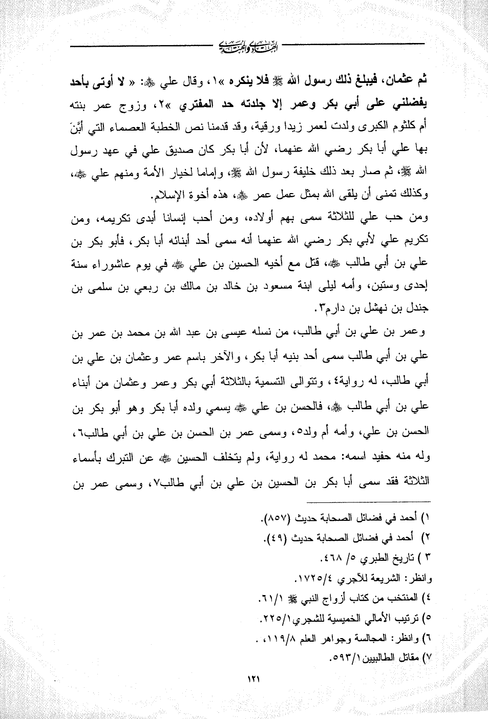 وعمر بن علي بن أبي طالب، من نسله عيسى بن عبد الله بن محمد بن عمر بن علي بن أبي طالب سمى أحد بنيه أبا بكر، والآخر باسم عمر وعثمان بن علي بن أبي طالب، له رواية (¬4)، وتتوالى التسمية بالثلاثة أبي بكر وعمر وعثمان من أبناء علي بن أبي طالب - رضي الله عنهم -، فالحسن بن علي - رضي الله عنه - يسمي ولده أبا بكر وهو أبو بكر بن الحسن بن علي، وأمه أم ولد (¬5)، وسمى عمر بن الحسن بن علي بن أبي طالب (¬6)، وله منه حفيد اسمه: محمد له رواية، ولم يتخلف الحسين - رضي الله عنه - عن التبرك بأسماء الثلاثة فقد سمى أبا بكر بن الحسين بن علي بن أبي طالب (¬7)، وسمى عمر بن
