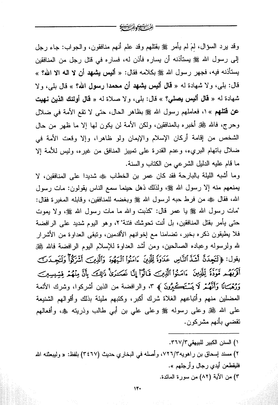 وما أشبه الليلة بالبارحة فقد كان عمر بن الخطاب - رضي الله عنه - شديدا على المنافقين، لا يمنعهم منه إلا رسول الله - صلى الله عليه وسلم -، ولذلك ذهل حينما سمع الناس يقولون: مات رسول الله، فقال - رضي الله عنه - من فرط حبه لرسول الله - صلى الله عليه وسلم - وبغضه للمنافقين، وقابله المغيرة فقال: "مات رسول الله - صلى الله عليه وسلم - يا عمر قال: "كذبت والله ما مات رسول الله - صلى الله عليه وسلم -، ولا يموت حتى يأمر بقتل المنافقين، بل أنت تحوشك فتنة" (¬2)، وهو اليوم شديد على الرافضة فلا يطيقون ذكره بخير، تضامنا مع إخوانهم الأقدمين، وتبقى العداوة من الأشرار لله ولرسوله وعباده الصالحين، ومن أشد العداوة للإسلام اليوم الرافضة فالله - عز وجل - يقول: {لَتَجِدَنَّ أَشَدَّ النَّاسِ عَدَاوَةً لِلَّذِينَ آمَنُوا الْيَهُودَ وَالَّذِينَ أَشْرَكُوا وَلَتَجِدَنَّ أَقْرَبَهُمْ مَوَدَّةً لِلَّذِينَ آمَنُوا الَّذِينَ قَالُوا إِنَّا نَصَارَى ذَلِكَ بِأَنَّ مِنْهُمْ قِسِّيسِينَ وَرُهْبَانًا وَأَنَّهُمْ لَا يَسْتَكْبِرُونَ} (¬3)، والرافضة من الذين أشركوا، وشرك الأئمة المضلين منهم وأتباعهم الغلاة شرك أكبر، وكتبهم مليئة بذلك وأقوالهم الشنيعة على الله - عز وجل - وعلى رسوله - صلى الله عليه وسلم - وعلى علي بن أبي طالب وذريته - رضي الله عنهم -، وأفعالهم تقضي بأنهم مشركون.