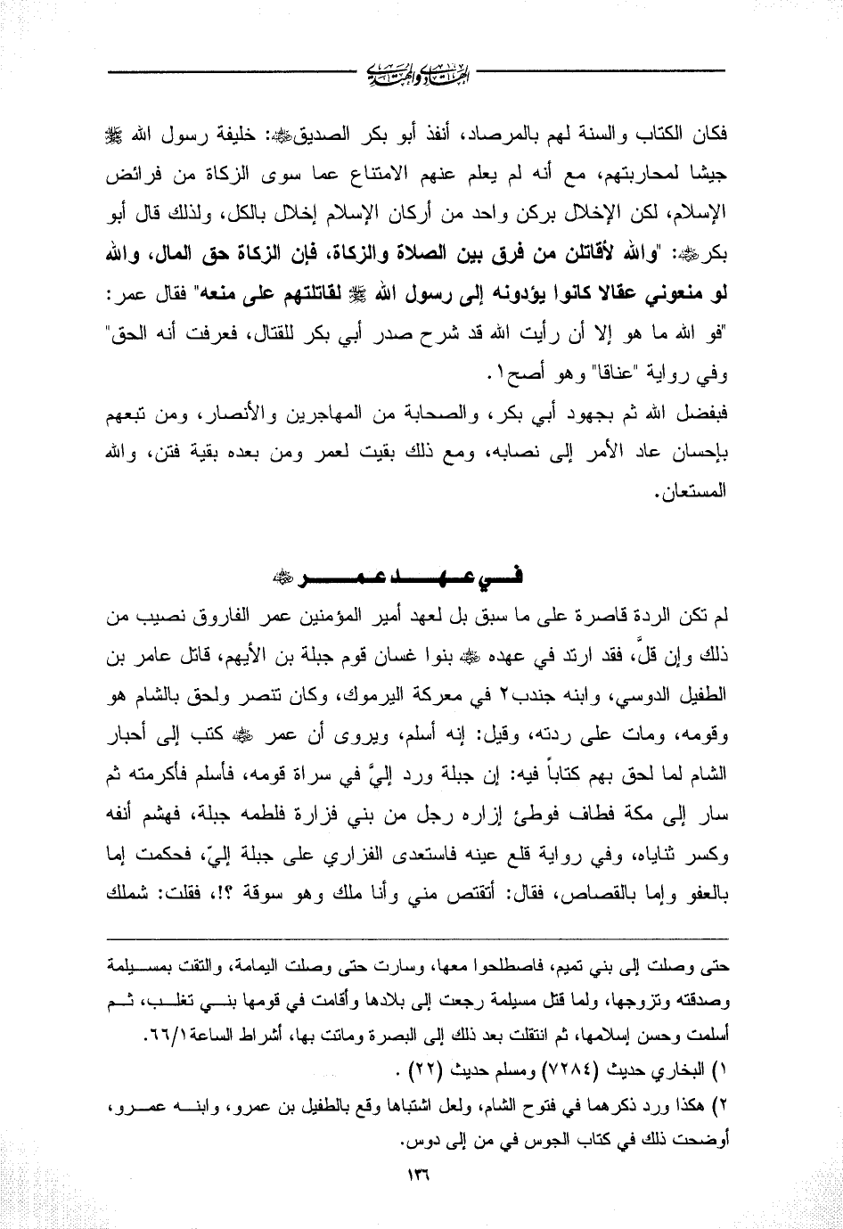 فكان الكتاب والسنة لهم بالمرصاد، أنفذ أبو بكر الصديق - رضي الله عنه -: خليفة رسول الله - صلى الله عليه وسلم - جيشا لمحاربتهم، مع أنه لم يعلم عنهم الامتناع عما سوى الزكاة من فرائض الإسلام، لكن الإخلال بركن واحد من أركان الإسلام إخلال بالكل، ولذلك قال أبو بكر - رضي الله عنه -: "والله لأقاتلن من فرق بين الصلاة والزكاة، فإن الزكاة حق المال، والله لو منعوني عقالا كانوا يؤدونه إلى رسول الله - صلى الله عليه وسلم - لقاتلتهم على منعه" فقال عمر: "فو الله ما هو إلا أن رأيت الله قد شرح صدر أبي بكر للقتال، فعرفت أنه الحق" وفي رواية "عناقا" وهو أصح (¬1).