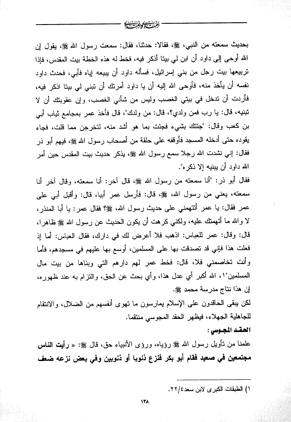 بحديث سمعته من النبي، - صلى الله عليه وسلم -، فقالا: حدثنا، فقال: سمعت رسول الله - صلى الله عليه وسلم -، يقول إن الله أوحى إلى داود أن ابن لي بيتا أذكر فيه، فخط له هذه الخطة بيت المقدس، فإذا تربيعها بيت رجل من بني إسرائيل، فسأله داود أن يبيعه إياه فأبي، فحدث داود نفسه أن يأخذ منه، فأوحى الله إليه أن يا داود أمرتك أن تبني لي بيتا اذكر فيه، فأردت أن تدخل في بيتي الغصب وليس من شأني الغصب، وإن عقوبتك أن لا تبنيه، قال: يا رب فمن ولدي؟ ، قال: من ولدك"، قال فأخذ عمر بمجامع ثياب أبي بن كعب وقال: "جئتك بشيء فجئت بما هو أشد منه، لتخرجن مما قلت، فجاء يقوده حتى أدخله المسجد فأوقفه على حلقة من أصحاب رسول الله - صلى الله عليه وسلم -، فيهم أبو ذر فقال: إني نشدت الله رجلا سمع رسول الله - صلى الله عليه وسلم -، يذكر حديث بيت المقدس حين أمر الله داود أن يبنيه إلا ذكره".