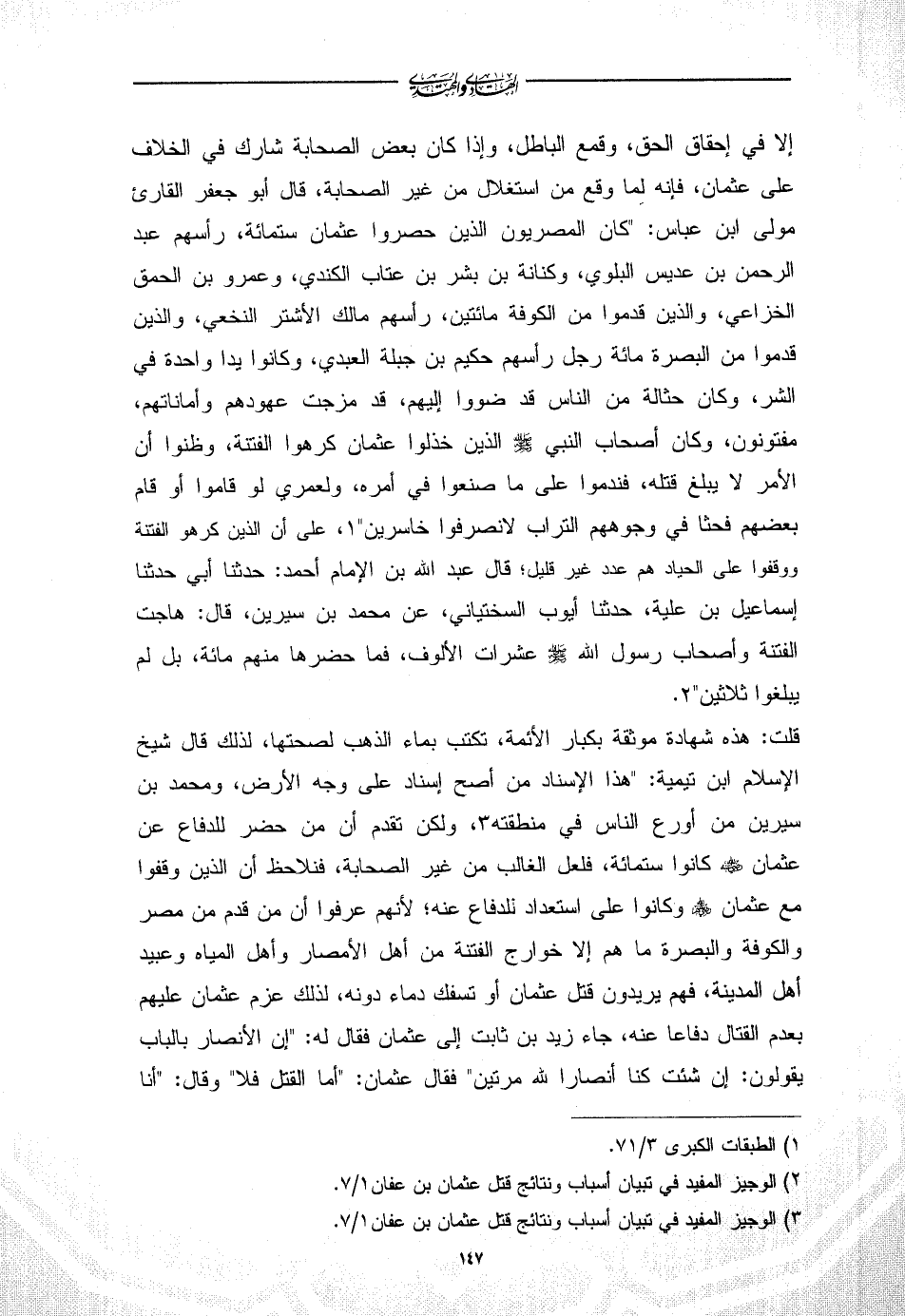 قلت: هذه شهادة موثقة بكبار الأئمة، تكتب بماء الذهب لصحتها، لذلك قال شيخ الإسلام ابن تيمية: "هذا الإسناد من أصح إسناد على وجه الأرض، ومحمد بن سيرين من أورع الناس في منطقته (¬3)، ولكن تقدم أن من حضر للدفاع عن عثمان - رضي الله عنه - كانوا ستمائة، فلعل الغالب من غير الصحابة، فنلاحظ أن الذين وقفوا مع عثمان - رضي الله عنهم - وكانوا على استعداد للدفاع عنه؛ لأنهم عرفوا أن من قدم من مصر والكوفة والبصرة ما هم إلا خوارج الفتنة من أهل الأمصار وأهل المياه وعبيد أهل المدينة، فهم يريدون قتل عثمان أو تسفك دماء دونه، لذلك عزم عثمان عليهم بعدم القتال دفاعا عنه، جاء زيد بن ثابت إلى عثمان فقال له: "إن الأنصار بالباب يقولون: إن شئت كنا أنصارا لله مرتين" فقال عثمان: "أما القتل فلا" وقال: "أنا