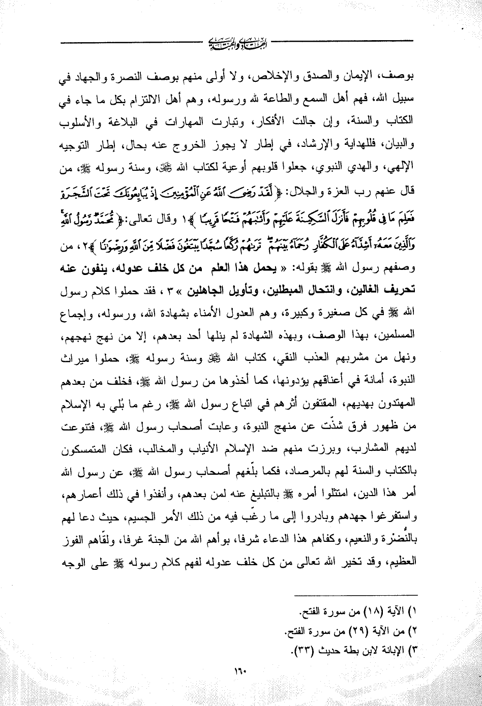 بوصف، الإيمان والصدق والإخلاص، ولا أولى منهم بوصف النصرة والجهاد في سبيل الله، فهم أهل السمع والطاعة لله ورسوله، وهم أهل الالتزام بكل ما جاء في الكتاب والسنة، وإن جالت الأفكار، وتبارت المهارات في البلاغة والأسلوب والبيان، فللهداية والإرشاد، في إطار لا يجوز الخروج عنه بحال، إطار التوجيه الإلهي، والهدي النبوي، جعلوا قلوبهم أوعية لكتاب الله - عز وجل -، وسنة رسوله - صلى الله عليه وسلم -، من قال عنهم رب العزة والجلال: {لَقَدْ رَضِيَ اللَّهُ عَنِ الْمُؤْمِنِينَ إِذْ يُبَايِعُونَكَ تَحْتَ الشَّجَرَةِ فَعَلِمَ مَا فِي قُلُوبِهِمْ فَأَنْزَلَ السَّكِينَةَ عَلَيْهِمْ وَأَثَابَهُمْ فَتْحًا قَرِيبًا} (¬1) وقال تعالى: {مُحَمَّدٌ رَسُولُ اللَّهِ وَالَّذِينَ مَعَهُ أَشِدَّاءُ عَلَى الْكُفَّارِ رُحَمَاءُ بَيْنَهُمْ تَرَاهُمْ رُكَّعًا سُجَّدًا يَبْتَغُونَ فَضْلًا مِنَ اللَّهِ وَرِضْوَانًا} (¬2)، من وصفهم رسول الله - صلى الله عليه وسلم - بقوله: «يحمل هذا العلم من كل خلف عدوله، ينفون عنه تحريف الغالين، وانتحال المبطلين، وتأويل الجاهلين» (¬3)،