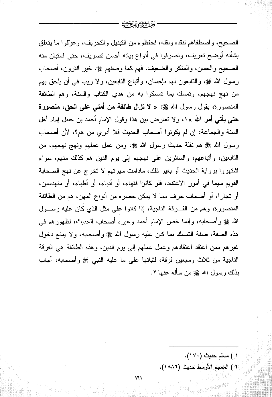 الصحيح، واصطفاهم لنقده ونقله، فحفظوه من التبديل والتحريف، وعرّفوا ما يتعلق بشأنه أوضح تعريف، وتصرفوا في أنواع بيانه أحسن تصريف، حتى استبان منه الصحيح والحسن، والمنكر والضعيف، فهم كما وصفهم - صلى الله عليه وسلم -، خير القرون، أصحاب رسول الله - صلى الله عليه وسلم -، والتابعون لهم بإحسان، وأتباع التابعين، ولا ريب في أن يلحق بهم من نهج نهجهم، وتمسك بما تمسكوا به من هدي الكتاب والسنة، وهم الطائفة المنصورة، يقول رسول الله - صلى الله عليه وسلم -: «لا تزال طائفة من أمتي على الحق، منصورة حتى يأتي أمر الله» (¬1)، ولا تعارض بين هذا وقول الإمام أحمد بن حنبل إمام أهل السنة والجماعة: إن لم يكونوا أصحاب الحديث فلا أدري من هم؟ ، لأن أصحاب رسول الله - صلى الله عليه وسلم - هم نقلة حديث رسول الله - صلى الله عليه وسلم -، ومن عمل عملهم ونهج نهجهم، من التابعين، وأتباعهم، والسائرين على نهجهم إلى يوم الدين هم كذلك منهم، سواء اشتهروا برواية الحديث أو بغير ذلك، مادامت سيرتهم لا تخرج عن نهج الصحابة القويم سيما في أمور الاعتقاد، فلو كانوا فقهاء، أو أدباء، أو أطباء، أو منهدسين، أو تجارا، أو أصحاب حرف مما لا يمكن حصره من أنواع المهن، هم من الطائفة المنصورة، وهم من الفرقة الناجية، إذا كانوا على مثل الذي كان عليه رسول الله - صلى الله عليه وسلم - وأصحابه، وإنما خص الإمام أحمد وغيره أصحاب الحديث، لظهورهم في هذه الصفة، صفة التمسك بما كان عليه رسول الله - صلى الله عليه وسلم - وأصحابه، ولا يمنع دخول غيرهم ممن اعتقد اعتقادهم وعمل عملهم إلى يوم الدين، وهذه الطائفة هي الفرقة الناجية من ثلاث وسبعين فرقة، لثباتها على ما عليه النبي - صلى الله عليه وسلم - وأصحابه، أجاب بذلك رسول الله - صلى الله عليه وسلم - من سأله عنها (¬2).