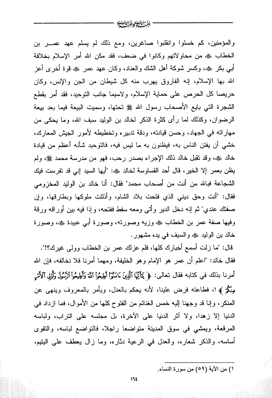 فقال خالد: "اعلم أن عمر هو الإمام وهو الخليفة، ومهما أمرنا فلا نخالفه، فإن الله أمرنا بذلك في كتابه فقال تعالى: {يَاأَيُّهَا الَّذِينَ آمَنُوا أَطِيعُوا اللَّهَ وَأَطِيعُوا الرَّسُولَ وَأُولِي الْأَمْرِ مِنْكُمْ} (¬1)، فطاعته فرض علينا، لأنه يحكم بالعدل، ويأمر بالمعروف وينهى عن المنكر، وإنا قد وجهنا إليه خمس الغنائم من الفتوح كلها من الأموال، فما ازداد في الدنيا إلا زهدا، ولا آثر الدنيا على الآخرة، بل مجلسه على التراب، ولباسه المرقعة، ويمشي في سوق المدينة متواضعا راجلا، فالتواضع لباسه، والتقوى أساسه، والذكر شعاره، والعدل في الرعية دثاره، وما زال يعطف على اليتيم،