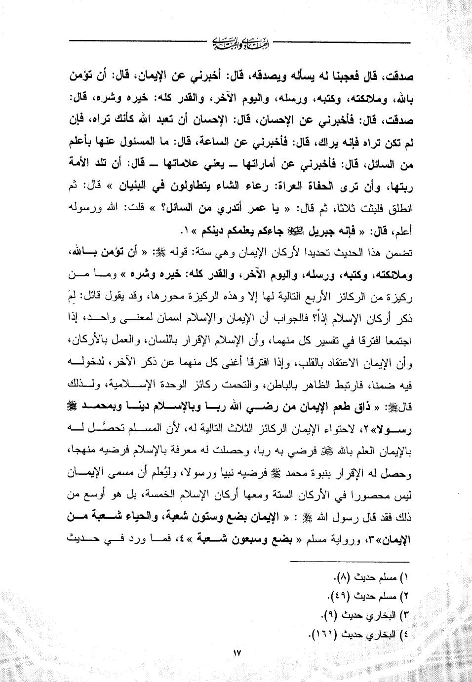 صدقت، قال فعجبنا له يسأله ويصدقه، قال: أخبرني عن الإيمان، قال: أن تؤمن بالله، وملائكته، وكتبه، ورسله، واليوم الآخر، والقدر كله: خيره وشره، قال: صدقت، قال: فأخبرني عن الإحسان، قال: الإحسان أن تعبد الله كأنك تراه، فإن لم تكن تراه فإنه يراك، قال: فأخبرني عن الساعة، قال: ما المسئول عنها بأعلم من السائل، قال: فأخبرني عن أماراتها - يعني علاماتها - قال: أن تلد الأمة ربتها، وأن ترى الحفاة العراة: رعاء الشاء يتطاولون في البنيان» قال: ثم انطلق فلبثت ثلاثا، ثم قال: «يا عمر أتدري من السائل؟ » قلت: الله ورسوله أعلم، قال: «فإنه جبريل - عليه السلام - جاءكم يعلمكم دينكم» (¬1).