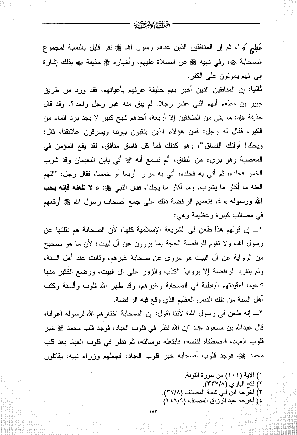 ثانيا: إن المنافقين الذين أخبر بهم حذيفة عرفهم بأعيانهم، فقد ورد من طريق جبير بن مطعم أنهم اثنى عشر رجلا، لم يبق منه غير رجل واحد (¬2)، وقد قال حذيفة - رضي الله عنه -: ما بقي من المنافقين إلا أربعة، أحدهم شيخ كبير لا يجد برد الماء من الكبر، فقال له رجل: فمن هؤلاء الذين ينقبون بيوتنا ويسرقون علائقنا، قال: ويحك! أولئك الفساق (¬3)، وهو كذلك فما كل فاسق منافق، فقد يقع المؤمن في المعصية وهو بريء من النفاق، ألم تسمع أنه - صلى الله عليه وسلم - أتي بابن النعيمان وقد شرب الخمر فجلده، ثم أتي به فجلده، أتي به مرارا أربعا أو خمسا، فقال رجل: "اللهم العنه ما أكثر ما يشرب، وما أكثر ما يجلد"، فقال النبي - صلى الله عليه وسلم -: «لا تلعنه فإنه يحب الله ورسوله» (¬4)، فتعميم الرافضة ذلك على جمع أصحاب رسول الله - صلى الله عليه وسلم - أوقعهم في مصائب كبيرة وعظيمة وهي:
