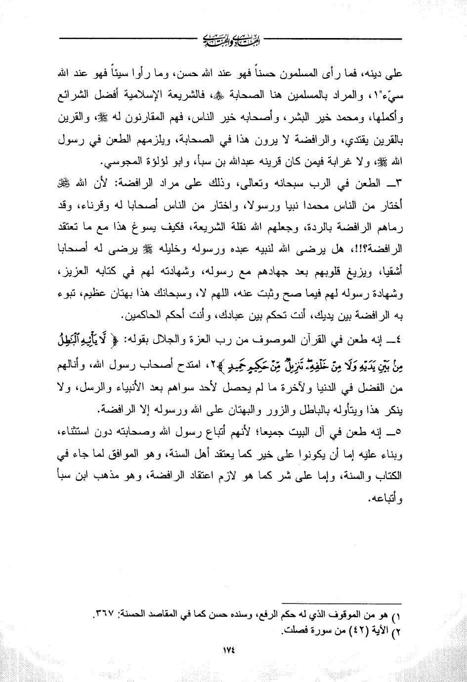 4 - إنه طعن في القرآن الموصوف من رب العزة والجلال بقوله: {لَا يَأْتِيهِ الْبَاطِلُ مِنْ بَيْنِ يَدَيْهِ وَلَا مِنْ خَلْفِهِ تَنْزِيلٌ مِنْ حَكِيمٍ حَمِيدٍ} (¬2)، امتدح أصحاب رسول الله، وأنالهم من الفضل في الدنيا ولآخرة ما لم يحصل لأحد سواهم بعد الأنبياء والرسل، ولا ينكر هذا ويتأوله بالباطل والزور والبهتان على الله ورسوله إلا الرافضة.