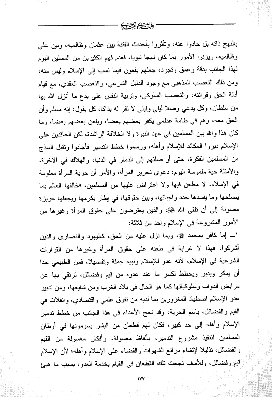 بالنهج ذاته بل حادوا عنه، وتأثروا بأحداث الفتنة بين عثمان وظالميه، وبين علي وظالميه، ويزنوا الأمور بما كان نهجا نبويا، فعدم فهم الكثيرين من المسلين اليوم لهذا الجانب بدقة وعمق وتجرد، جعلهم يقعون فيما نسب إلى الإسلام وليس منه، ومن ذلك التعصب المذهبي مع وجود الدليل الشرعي، والتعصب العقدي، مع قيام أدلة الحق وقرائنه، والتعصب السلوكي، وتربية النفس على بدع ما أنزل الله بها من سلطان، وكل يدعي وصلا ليلى وليلى لا تقر له بذاكا، كل يقول: إنه مسلم وأن الحق معه، وهم في طامة عظمى يكفر بعضهم بعضا، ويلعن بعضهم بعضا، وما كان هذا والله بين المسلمين في عهد النبوة ولا الخلافة الراشدة، لكن الحاقدين على الإسلام دبروا المكائد للإسلام وأهله، ورسموا خطط التدمير فأجادوا وتقبل السذج من المسلمين الفكرة، حتى أو صلتهم إلى الدمار في الدنيا، والهلاك في الآخرة، والأمثلة حية ملموسة اليوم: دعوى تحرير المرأة، والأمر أن حرية المرأة معلومة في الإسلام، لا مطعن فيها ولا اعتراض عليها من المسلمين، فخالقها العالم بما يصلحها وما يفسدها حدد واجباتها، وبين حقوقها، في إطار يكرمها ويجعلها عزيزة مصونة إلى أن تلقى الله - عز وجل -، والذين يعترضون على حقوق المرأة وغيرها من الأمور المشروعة في الإسلام واحد من ثلاثة:
