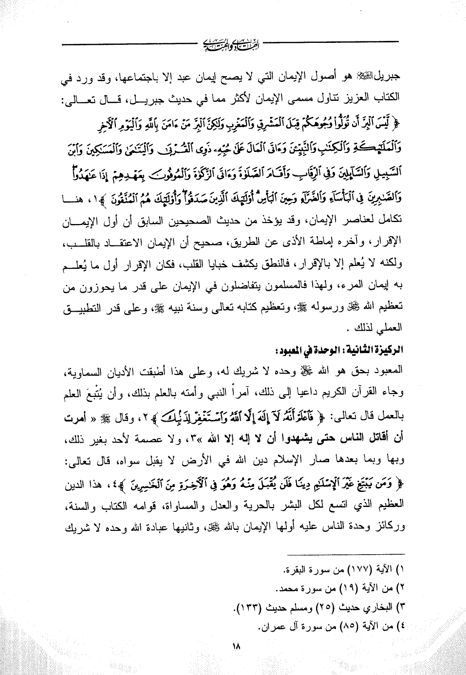 المعبود بحق هو الله - جل جلاله - وحده لا شريك له، وعلى هذا أطبقت الأديان السماوية، وجاء القرآن الكريم داعيا إلى ذلك، آمراً النبي وأمته بالعلم بذلك، وأن يُتْبعَ العلم بالعمل قال تعالى: {فَاعْلَمْ أَنَّهُ لَا إِلَهَ إِلَّا اللَّهُ وَاسْتَغْفِرْ لِذَنْبِكَ} (¬2)، وقال - صلى الله عليه وسلم - «أمرت أن أقاتل الناس حتى يشهدوا أن لا إله إلا الله» (¬3)، ولا عصمة لأحد بغير ذلك، وبها وبما بعدها صار الإسلام دين الله في الأرض لا يقبل سواه، قال تعالى: {وَمَنْ يَبْتَغِ غَيْرَ الْإِسْلَامِ دِينًا فَلَنْ يُقْبَلَ مِنْهُ وَهُوَ فِي الْآخِرَةِ مِنَ الْخَاسِرِينَ} (¬4)، هذا الدين العظيم الذي اتسع لكل البشر بالحرية والعدل والمساواة، قوامه الكتاب والسنة، وركائز وحدة الناس عليه أولها الإيمان بالله - عز وجل -، وثانيها عبادة الله وحده لا شريك