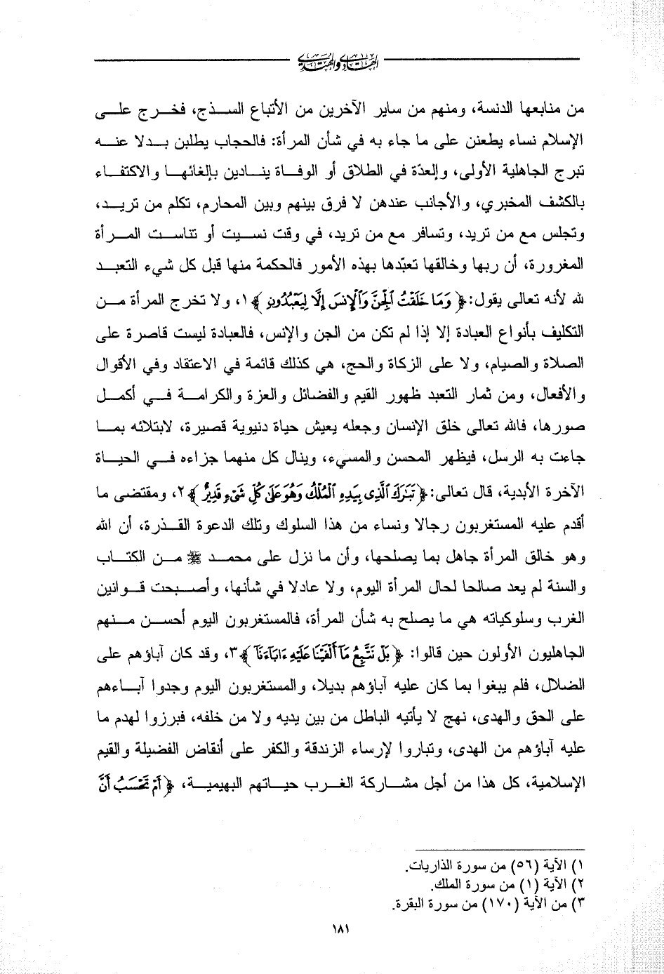 من منابعها الدنسة، ومنهم من ساير الآخرين من الأتباع السذج، فخرج على الإسلام نساء يطعنن على ما جاء به في شأن المرأة: فالحجاب يطلبن بدلا عنه تبرج الجاهلية الأولى، وإلعدّة في الطلاق أو الوفاة ينادين بإلغائها والاكتفاء بالكشف المخبري، والأجانب عندهن لا فرق بينهم وبين المحارم، تكلم من تريد، وتجلس مع من تريد، وتسافر مع من تريد، في وقت نسيت أو تناست المرأة المغرورة، أن ربها وخالقها تعبّدها بهذه الأمور فالحكمة منها قبل كل شيء التعبد لله لأنه تعالى يقول: {وَمَا خَلَقْتُ الْجِنَّ وَالْإِنْسَ إِلَّا لِيَعْبُدُونِ} (¬1)، ولا تخرج المرأة من التكليف بأنواع العبادة إلا إذا لم تكن من الجن والإنس، فالعبادة ليست قاصرة على الصلاة والصيام، ولا على الزكاة والحج، هي كذلك قائمة في الاعتقاد وفي الأقوال والأفعال، ومن ثمار التعبد ظهور القيم والفضائل والعزة والكرامة في أكمل صورها، فالله تعالى خلق الإنسان وجعله يعيش حياة دنيوية قصيرة، لابتلائه بما جاءت به الرسل، فيظهر المحسن والمسيء، وينال كل منهما جزاءه في الحياة الآخرة الأبدية، قال تعالى: {تَبَارَكَ الَّذِي بِيَدِهِ الْمُلْكُ وَهُوَ عَلَى كُلِّ شَيْءٍ قَدِيرٌ} (¬2)، ومقتضى ما أقدم عليه المستغربون رجالا ونساء من هذا السلوك وتلك الدعوة القذرة، أن الله وهو خالق المرأة جاهل بما يصلحها، وأن ما نزل على محمد - صلى الله عليه وسلم - من الكتاب والسنة لم يعد صالحا لحال المرأة اليوم، ولا عادلا في شأنها، وأصبحت قوانين الغرب وسلوكياته هي ما يصلح به شأن المرأة، فالمستغربون اليوم أحسن منهم الجاهليون الأولون حين قالوا: {بَلْ نَتَّبِعُ مَا أَلْفَيْنَا عَلَيْهِ آبَاءَنَا} (¬3)، وقد كان آباؤهم على الضلال، فلم يبغوا بما كان عليه آباؤهم بديلا، والمستغربون اليوم وجدوا آباءهم على الحق والهدى، نهج لا يأتيه الباطل من بين يديه ولا من خلفه، فبرزوا لهدم ما عليه آباؤهم من الهدى، وتباروا لإرساء الزندقة والكفر على أنقاض الفضيلة والقيم الإسلامية، كل هذا من أجل مشاركة الغرب حياتهم البهيمية، {أَمْ تَحْسَبُ أَنَّ
