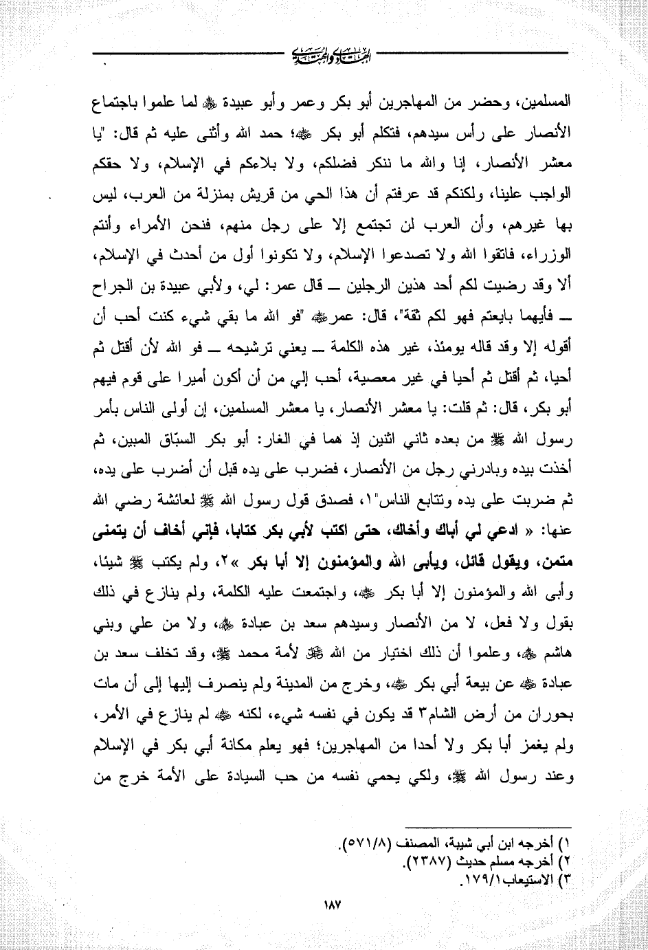 المسلمين، وحضر من المهاجرين أبو بكر وعمر وأبو عبيدة - رضي الله عنهم - لما علموا باجتماع الأنصار على رأس سيدهم، فتكلم أبو بكر - رضي الله عنه -؛ حمد الله وأثنى عليه ثم قال: "يا معشر الأنصار، إنا والله ما ننكر فضلكم، ولا بلاءكم في الإسلام، ولا حقكم الواجب علينا، ولكنكم قد عرفتم أن هذا الحي من قريش بمنزلة من العرب، ليس بها غيرهم، وأن العرب لن تجتمع إلا على رجل منهم، فنحن الأمراء وأنتم الوزراء، فاتقوا الله ولا تصدعوا الإسلام، ولا تكونوا أول من أحدث في الإسلام، ألا وقد رضيت لكم أحد هذين الرجلين - قال عمر: لي، ولأبي عبيدة بن الجراح - فأيهما بايعتم فهو لكم ثقة"، قال: عمر - رضي الله عنه - "فو الله ما بقي شيء كنت أحب أن أقوله إلا وقد قاله يومئذ، غير هذه الكلمة - يعني ترشيحه - فو الله لأن أقتل ثم أحيا، ثم أقتل ثم أحيا في غير معصية، أحب إلي من أن أكون أميرا على قوم فيهم أبو بكر، قال: ثم قلت: يا معشر الأنصار، يا معشر المسلمين، إن أولى الناس بأمر رسول الله - صلى الله عليه وسلم - من بعده ثاني اثنين إذ هما في الغار: أبو بكر السبّاق المبين، ثم أخذت بيده وبادرني رجل من الأنصار، فضرب على يده قبل أن أضرب على يده، ثم ضربت على يده وتتابع الناس" (¬1)، فصدق قول رسول الله - صلى الله عليه وسلم - لعائشة رضي الله عنها: «ادعي لي أباك وأخاك، حتى اكتب لأبي بكر كتابا، فإني أخاف أن يتمنى متمن، ويقول قائل، ويأبى الله والمؤمنون إلا أبا بكر» (¬2)، ولم يكتب - صلى الله عليه وسلم - شيئا، وأبى الله والمؤمنون إلا أبا بكر - رضي الله عنه -، واجتمعت عليه الكلمة، ولم ينازع في ذلك بقول ولا فعل، لا من الأنصار وسيدهم سعد بن عبادة - رضي الله عنهم -، ولا من علي وبني هاشم - رضي الله عنهم -، وعلموا أن ذلك اختيار من الله - عز وجل - لأمة محمد - صلى الله عليه وسلم -، وقد تخلف سعد بن عبادة - رضي الله عنه - عن بيعة أبي بكر - رضي الله عنه -، وخرج من المدينة ولم ينصرف إليها إلى أن مات بحوران من أرض الشام (¬3) قد يكون في نفسه شيء، لكنه - رضي الله عنه - لم ينازع في الأمر، ولم يغمز أبا بكر ولا أحدا من المهاجرين؛ فهو يعلم مكانة أبي بكر في الإسلام وعند رسول الله - صلى الله عليه وسلم -، ولكي يحمي نفسه من حب السيادة على الأمة خرج من