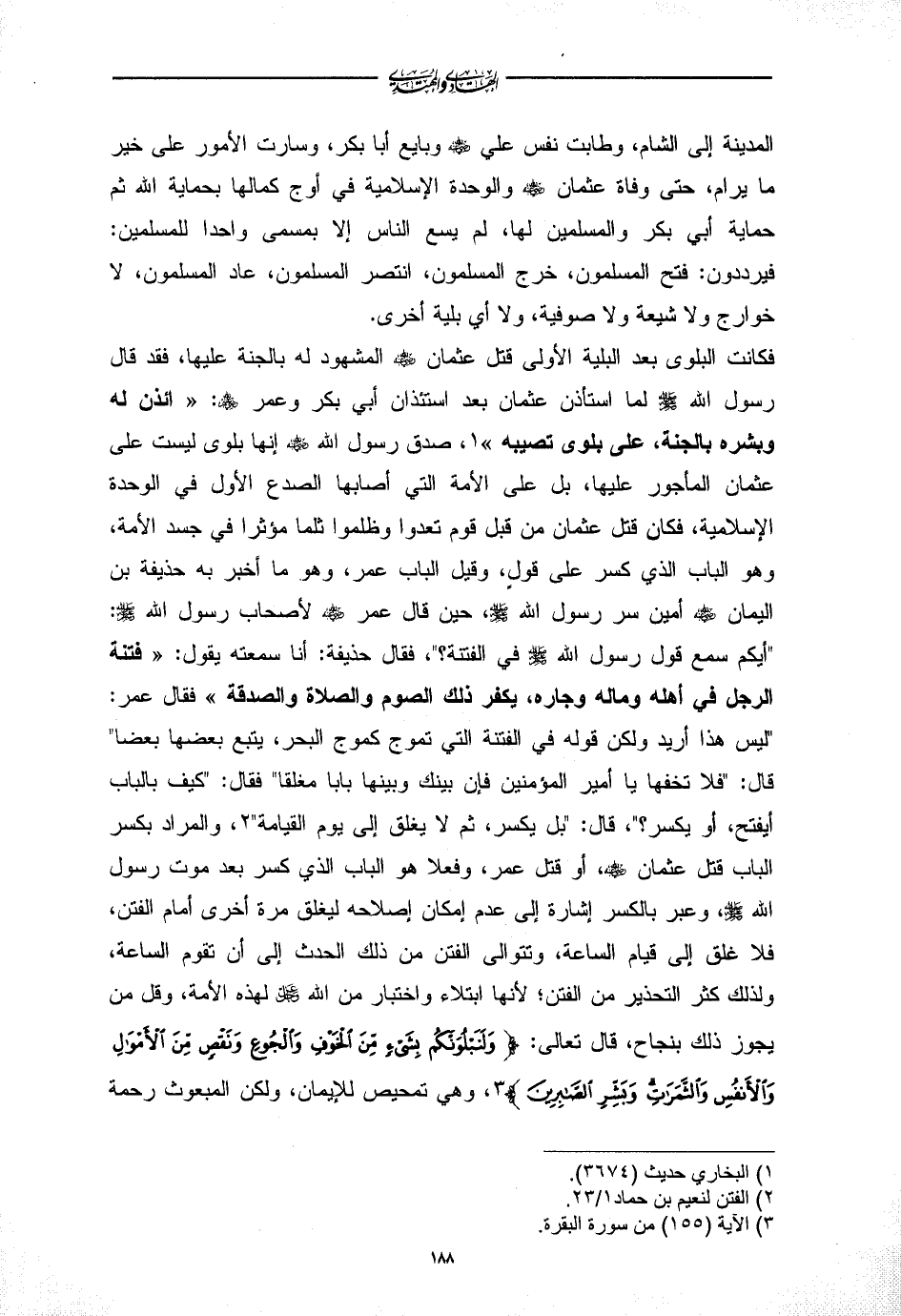 فكانت البلوى بعد البلية الأولى قتل عثمان - رضي الله عنه - المشهود له بالجنة عليها، فقد قال رسول الله - صلى الله عليه وسلم - لما استأذن عثمان بعد استئذان أبي بكر وعمر - رضي الله عنهم -: «ائذن له وبشره بالجنة، على بلوى تصيبه» (¬1)، صدق رسول الله - رضي الله عنه - إنها بلوى ليست على عثمان المأجور عليها، بل على الأمة التي أصابها الصدع الأول في الوحدة الإسلامية، فكان قتل عثمان من قبل قوم تعدوا وظلموا ثلما مؤثرا في جسد الأمة، وهو الباب الذي كسر على قولٍ، وقيل الباب عمر، وهو ما أخبر به حذيفة بن اليمان - رضي الله عنه - أمين سر رسول الله - صلى الله عليه وسلم -، حين قال عمر - رضي الله عنه - لأصحاب رسول الله - صلى الله عليه وسلم -: "أيكم سمع قول رسول الله - صلى الله عليه وسلم - في الفتنة؟ "، فقال حذيفة: أنا سمعته يقول: «فتنة الرجل في أهله وماله وجاره، يكفر ذلك الصوم والصلاة والصدقة» فقال عمر: "ليس هذا أريد ولكن قوله في الفتنة التي تموج كموج البحر، يتبع بعضها بعضا" قال: "فلا تخفها يا أمير المؤمنين فإن بينك وبينها بابا مغلقا" فقال: "كيف بالباب أيفتح، أو يكسر؟ "، قال: "بل يكسر، ثم لا يغلق إلى يوم القيامة" (¬2)، والمراد بكسر الباب قتل عثمان - رضي الله عنه -، أو قتل عمر، وفعلا هو الباب الذي كسر بعد موت رسول الله - صلى الله عليه وسلم -، وعبر بالكسر إشارة إلى عدم إمكان إصلاحه ليغلق مرة أخرى أمام الفتن، فلا غلق إلى قيام الساعة، وتتوالى الفتن من ذلك الحدث إلى أن تقوم الساعة، ولذلك كثر التحذير من الفتن؛ لأنها ابتلاء واختبار من الله - عز وجل - لهذه الأمة، وقل من يجوز ذلك بنجاح، قال تعالى: {وَلَنَبْلُوَنَّكُمْ بِشَيْءٍ مِنَ الْخَوْفِ وَالْجُوعِ وَنَقْصٍ مِنَ الْأَمْوَالِ وَالْأَنْفُسِ وَالثَّمَرَاتِ وَبَشِّرِ الصَّابِرِينَ} (¬3)، وهي تمحيص للإيمان، ولكن المبعوث رحمة