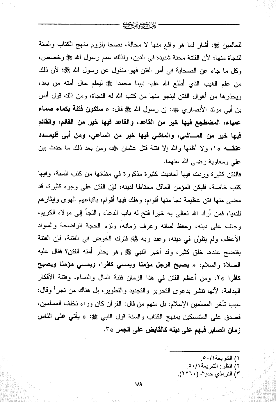 فالفتن كثيرة وردت فيها أحاديث كثيرة مذكورة في مظانها من كتب السنة، وفيها كتب خاصة، فليكن المؤمن العاقل محتاطا لدينه، فإن الفتن على وجوه كثيرة، قد مضى منها فتن عظيمة نجا منها أقوام، وهلك فيها أقوام، باتباعهم الهوى وإيثارهم للدنيا، فمن أراد الله تعالى به خيرا فتح له باب الدعاء والتجأ إلى مولاه الكريم، وخاف على دينه، وحفظ لسانه وعرف زمانه، ولزم الحجة الواضحة والسواد الأعظم، ولم يتلوَّن في دينه، وعبد ربه - عز وجل - فترك الخوض في الفتنة، فإن الفتنة يفتضح عندها خلق كثير، وقد أخبر النبي - صلى الله عليه وسلم - وهو يحذر أمته الفتن؟ فقال عليه الصلاة والسلام: «يصبح الرجل مؤمنا ويمسي كافرا، ويمسي مؤمنا ويصبح كافرا» (¬2)، ومن أعظم الفتن في هذا الزمان فتنة المال والنساء، وفتنة الأفكار الهدامة، لأنها تنشر بدعوى التحرير والتجديد والتطوير، بل هناك من تجرأ وقال: سبب تأخر المسلمين الإسلام، بل منهم من قال: القرآن كان وراء تخلف المسلمين، فصدق على المتمسكين بمنهج الكتاب والسنة قول النبي - صلى الله عليه وسلم -: «يأتي على الناس زمان الصابر فيهم على دينه كالقابض على الجمر» (¬3).