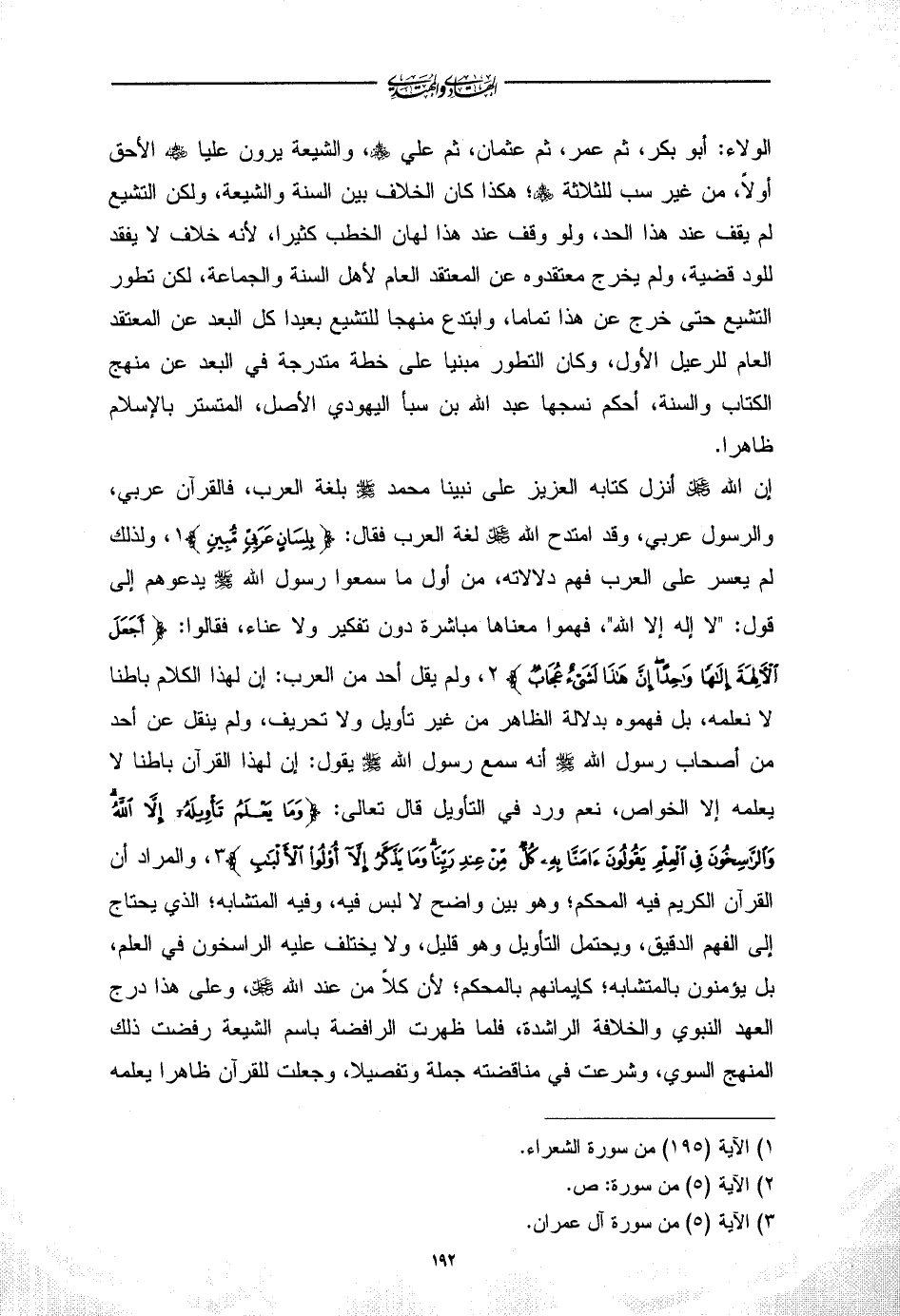 إن الله - عز وجل - أنزل كتابه العزيز على نبينا محمد - صلى الله عليه وسلم - بلغة العرب، فالقرآن عربي، والرسول عربي، وقد امتدح الله - عز وجل - لغة العرب فقال: {بِلِسَانٍ عَرَبِيٍّ مُبِينٍ} (¬1)، ولذلك لم يعسر على العرب فهم دلالاته، من أول ما سمعوا رسول الله - صلى الله عليه وسلم - يدعوهم إلى قول: "لا إله إلا الله"، فهموا معناها مباشرة دون تفكير ولا عناء، فقالوا: {أَجَعَلَ الْآلِهَةَ إِلَهًا وَاحِدًا إِنَّ هَذَا لَشَيْءٌ عُجَابٌ} (¬2)، ولم يقل أحد من العرب: إن لهذا الكلام باطنا لا نعلمه، بل فهموه بدلالة الظاهر من غير تأويل ولا تحريف، ولم ينقل عن أحد من أصحاب رسول الله - صلى الله عليه وسلم - أنه سمع رسول الله - صلى الله عليه وسلم - يقول: إن لهذا القرآن باطنا لا يعلمه إلا الخواص، نعم ورد في التأويل قال تعالى: {وَمَا يَعْلَمُ تَأْوِيلَهُ إِلَّا اللَّهُ وَالرَّاسِخُونَ فِي الْعِلْمِ يَقُولُونَ آمَنَّا بِهِ كُلٌّ مِنْ عِنْدِ رَبِّنَا وَمَا يَذَّكَّرُ إِلَّا أُولُو الْأَلْبَابِ} (¬3)، والمراد أن القرآن الكريم فيه المحكم؛ وهو بين واضح لا لبس فيه، وفيه المتشابه؛ الذي يحتاج إلى الفهم الدقيق، ويحتمل التأويل وهو قليل، ولا يختلف عليه الراسخون في العلم، بل يؤمنون بالمتشابه؛ كإيمانهم بالمحكم؛ لأن كلاً من عند الله - عز وجل -، وعلى هذا درج العهد النبوي والخلافة الراشدة، فلما ظهرت الرافضة باسم الشيعة رفضت ذلك المنهج السوي، وشرعت في مناقضته جملة وتفصيلا، وجعلت للقرآن ظاهرا يعلمه