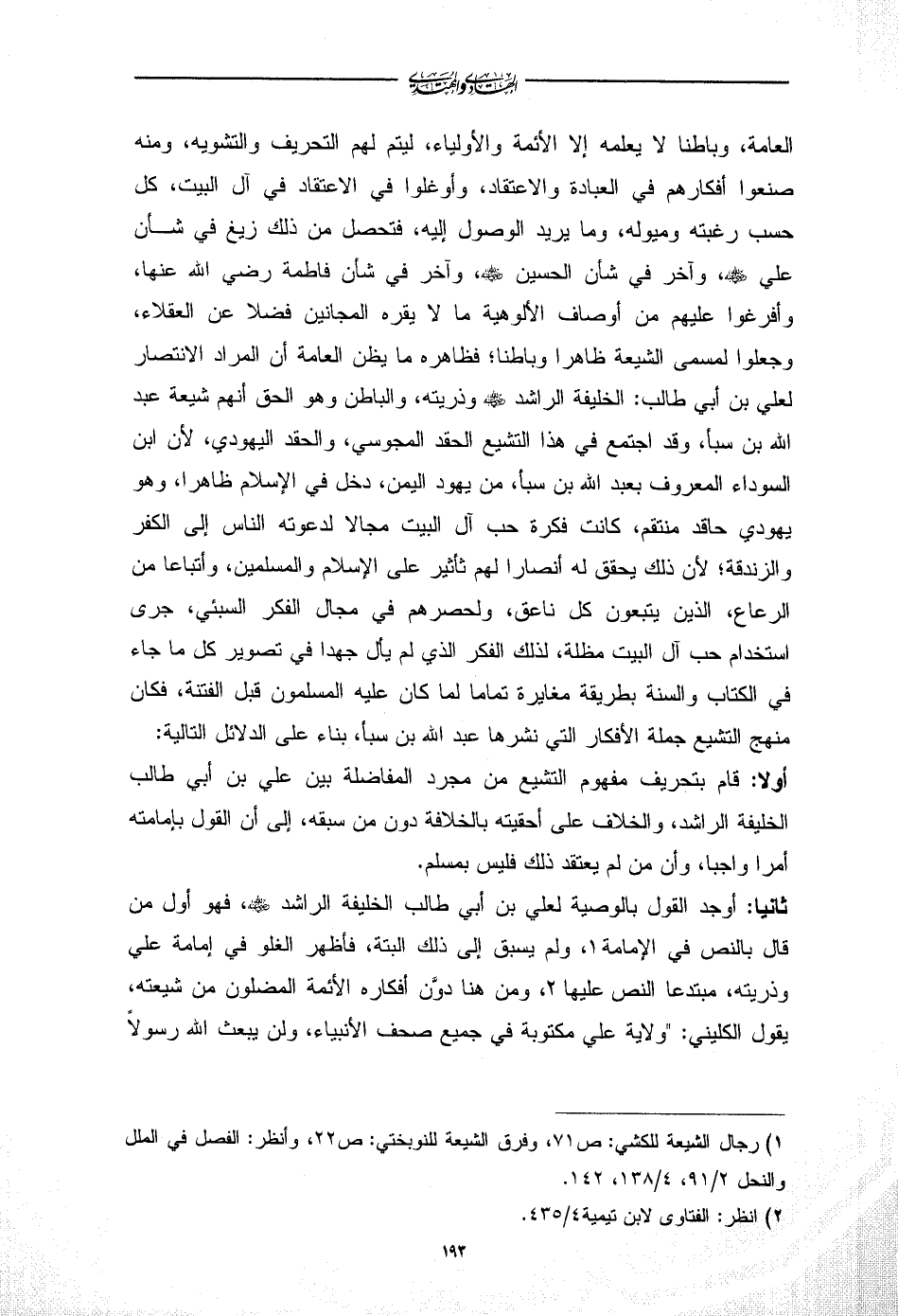 العامة، وباطنا لا يعلمه إلا الأئمة والأولياء، ليتم لهم التحريف والتشويه، ومنه صنعوا أفكارهم في العبادة والاعتقاد، وأوغلوا في الاعتقاد في آل البيت، كل حسب رغبته وميوله، وما يريد الوصول إليه، فتحصل من ذلك زيغ في شأن علي - رضي الله عنه -، وآخر في شأن الحسين - رضي الله عنه -، وآخر في شأن فاطمة رضي الله عنها، وأفرغوا عليهم من أوصاف الألوهية ما لا يقره المجانين فضلا عن العقلاء، وجعلوا لمسمى الشيعة ظاهرا وباطنا؛ فظاهره ما يظن العامة أن المراد الانتصار لعلي بن أبي طالب: الخليفة الراشد - رضي الله عنه - وذريته، والباطن وهو الحق أنهم شيعة عبد الله بن سبأ، وقد اجتمع في هذا التشيع الحقد المجوسي، والحقد اليهودي، لأن ابن السوداء المعروف بعبد الله بن سبأ، من يهود اليمن، دخل في الإسلام ظاهرا، وهو يهودي حاقد منتقم، كانت فكرة حب آل البيت مجالا لدعوته الناس إلى الكفر والزندقة؛ لأن ذلك يحقق له أنصارا لهم ثأثير على الإسلام والمسلمين، وأتباعا من الرعاع، الذين يتبعون كل ناعق، ولحصرهم في مجال الفكر السبئي، جرى استخدام حب آل البيت مظلة، لذلك الفكر الذي لم يأل جهدا في تصوير كل ما جاء في الكتاب والسنة بطريقة مغايرة تماما لما كان عليه المسلمون قبل الفتنة، فكان منهج التشيع جملة الأفكار التي نشرها عبد الله بن سبأ، بناء على الدلائل التالية: