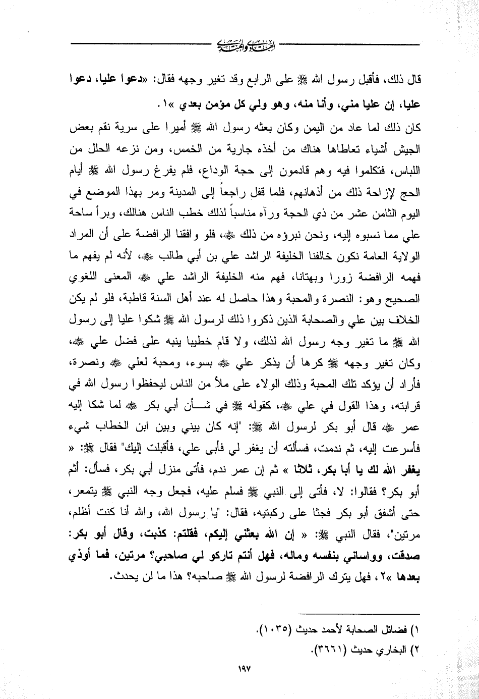 كان ذلك لما عاد من اليمن وكان بعثه رسول الله - صلى الله عليه وسلم - أميرا على سرية نقم بعض الجيش أشياء تعاطاها هناك من أخذه جارية من الخمس، ومن نزعه الحلل من اللباس، فتكلموا فيه وهم قادمون إلى حجة الوداع، فلم يفرغ رسول الله - صلى الله عليه وسلم - أيام الحج لإزاحة ذلك من أذهانهم، فلما قفل راجعاً إلى المدينة ومر بهذا الموضع في اليوم الثامن عشر من ذي الحجة ورآه مناسباً لذلك خطب الناس هنالك، وبرأ ساحة علي مما نسبوه إليه، ونحن نبرؤه من ذلك - رضي الله عنه -، فلو وافقنا الرافضة على أن المراد الولاية العامة نكون خالفنا الخليفة الراشد علي بن أبي طالب - رضي الله عنه -، لأنه لم يفهم ما فهمه الرافضة زورا وبهتانا، فهم منه الخليفة الراشد علي - رضي الله عنه - المعنى اللغوي الصحيح وهو: النصرة والمحبة وهذا حاصل له عند أهل السنة قاطبة، فلو لم يكن الخلاف بين علي والصحابة الذين ذكروا ذلك لرسول الله - صلى الله عليه وسلم - شكوا عليا إلى رسول الله - صلى الله عليه وسلم - ما تغير وجه رسول الله لذلك، ولا قام خطيبا ينبه على فضل علي - رضي الله عنه -، وكان تغير وجهه - صلى الله عليه وسلم - كرها أن يذكر علي - رضي الله عنه - بسوء، ومحبة لعلي - رضي الله عنه - ونصرة، فأراد أن يؤكد تلك المحبة وذلك الولاء على ملأ من الناس ليحفظوا رسول الله في قرابته، وهذا القول في علي - رضي الله عنه -، كقوله - صلى الله عليه وسلم - في شأن أبي بكر - رضي الله عنه - لما شكا إليه عمر - رضي الله عنه - قال أبو بكر لرسول الله - صلى الله عليه وسلم -: "إنه كان بيني وبين ابن الخطاب شيء فأسرعت إليه، ثم ندمت، فسألته أن يغفر لي فأبى علي، فأقبلت إليك" فقال - صلى الله عليه وسلم -: «يغفر الله لك يا أبا بكر، ثلاثا» ثم إن عمر ندم، فأتى منزل أبي بكر، فسأل: أثم أبو بكر؟ فقالوا: لا، فأتى إلى النبي - صلى الله عليه وسلم - فسلم عليه، فجعل وجه النبي - صلى الله عليه وسلم - يتمعر، حتى أشفق أبو بكر فجثا على ركبتيه، فقال: "يا رسول الله، والله أنا كنت أظلم، مرتين"، فقال النبي - صلى الله عليه وسلم -: «إن الله بعثني إليكم، فقلتم: كذبت، وقال أبو بكر: صدقت، وواساني بنفسه وماله، فهل أنتم تاركو لي صاحبي؟ مرتين، فما أوذي بعدها» (¬2)، فهل يترك الرافضة لرسول الله - صلى الله عليه وسلم - صاحبه؟ هذا ما لن يحدث.